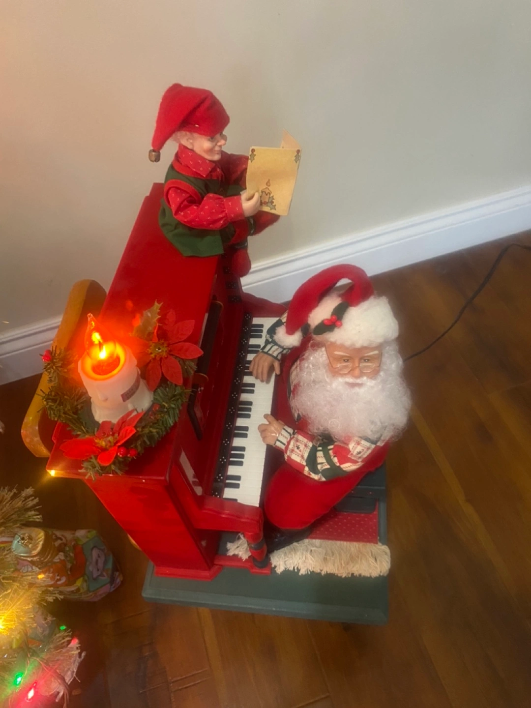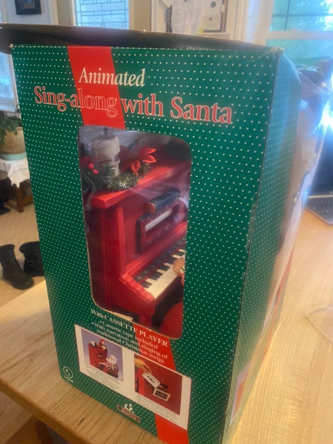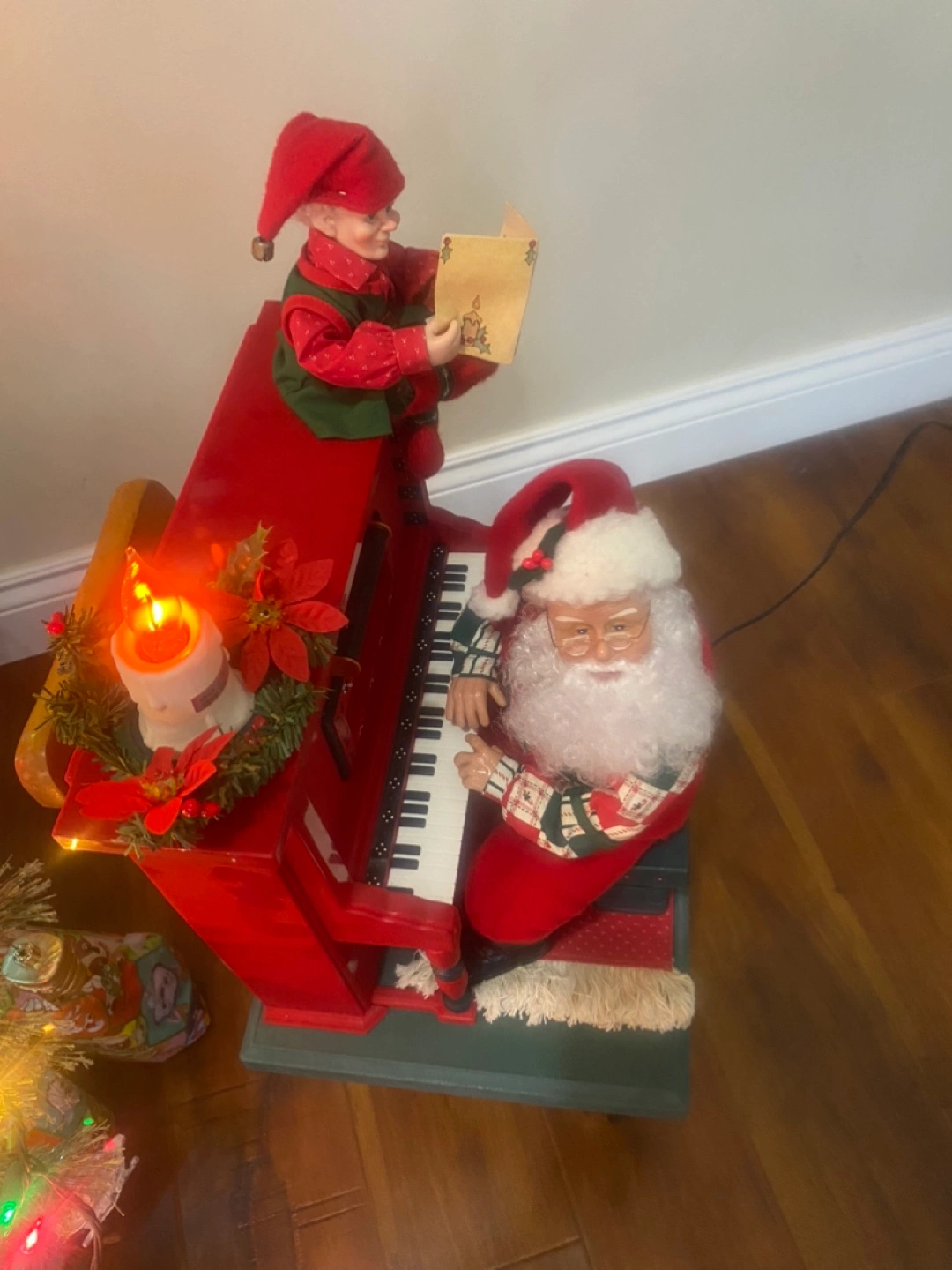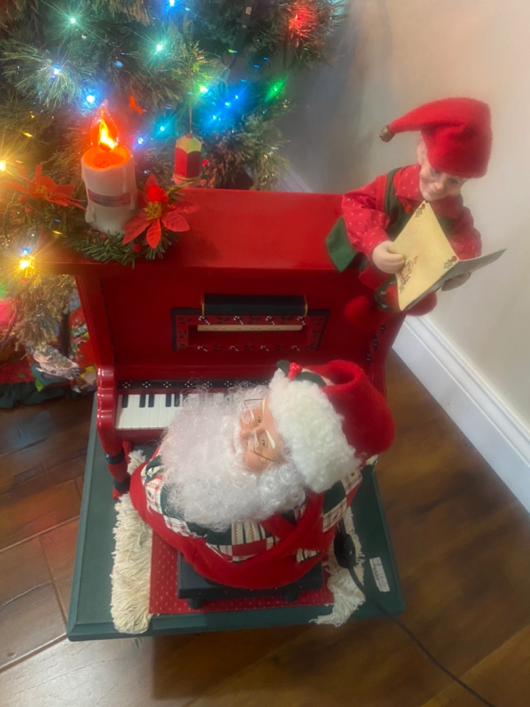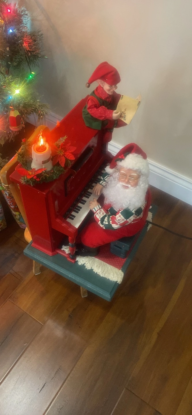 Vintage Animated Santa and elf playing piano, includes cassette player. Plays six traditional Christmas songs. Sings and tells a stories . Pick up Port Elmsley Perth