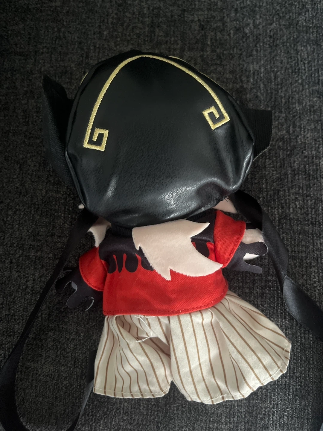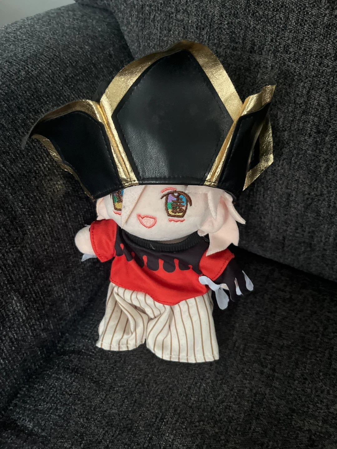 29Here is an anime plushie figure. It features a distinctive black and gold hat, a red and black shirt, and striped pants. It's in great condition and ready for a new home! New condition pet and smoke free home 🏠