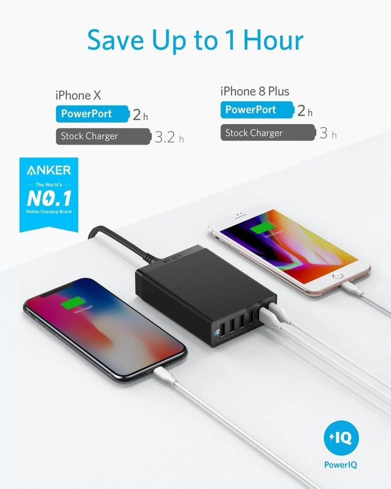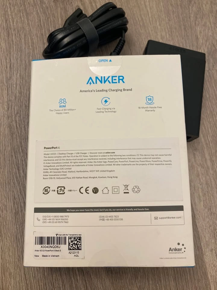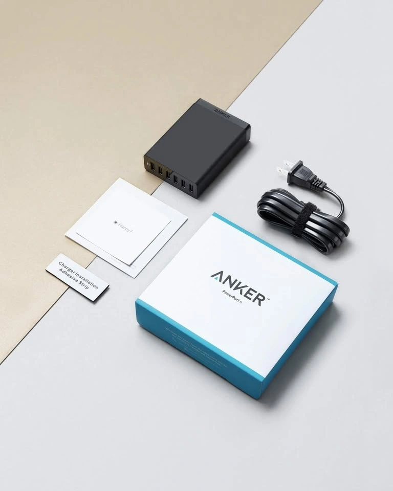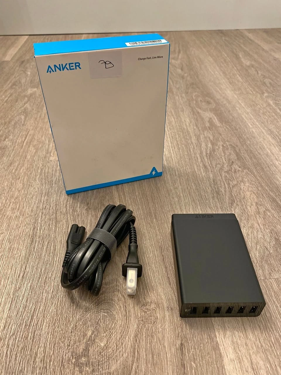 73π Anker PowerPort 6 β 6-Port USB Charger Ultra-fast charging: 2.4A per port, 12A total Charge 6 devices at the same time, 60W power Smart charging with PowerIQ and VoltageBoost technology UL certified with MultiProtect safety system Compatible worldwide with 100-240V Includes: PowerPort 6, 150 cm power cord, extra Velcro strap, user guide Let me know if you're interested!
