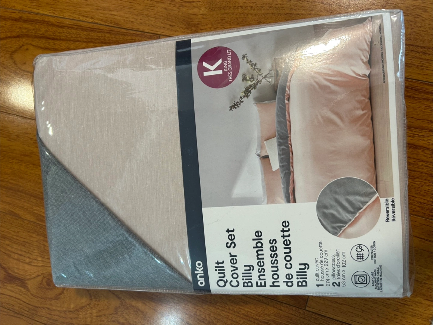 I have a brand new, still-in-packaging Anko Billy Quilt Cover Set for a king-size bed. It includes one quilt cover (274 cm x 229 cm) and two pillowcases (53 cm x 102 cm). The material is a polyester-cotton blend and it's machine washable for easy care! The set is reversible.