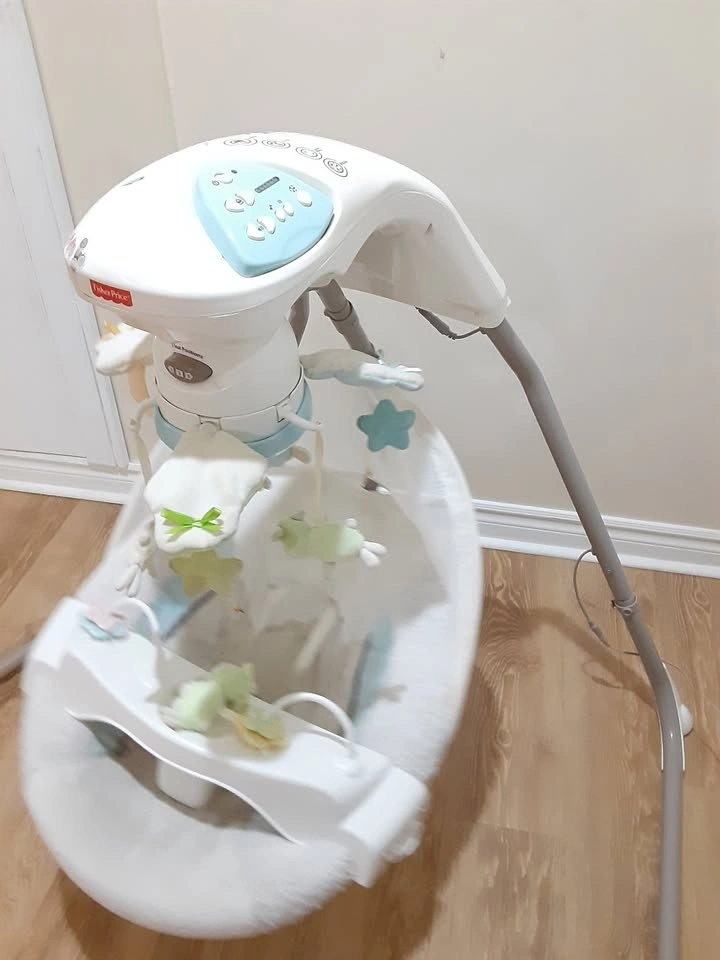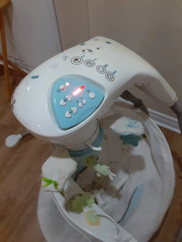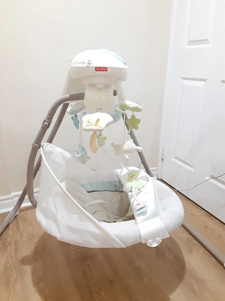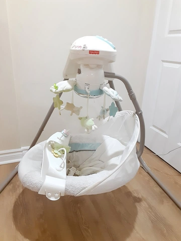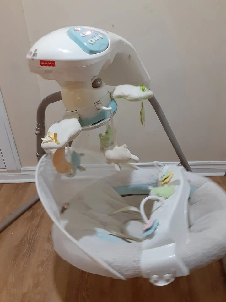 Compact baby swing designed to save space, ideal for any room. Carry handle for easy moving. Folds for storage. Adjustable speeds. Overhead toy bar with 2 soft toys. Infant head support (removable). 5-point harness. Battery operated. Washable fabric, cleaned and sanitized. Pet free, smoke free, bug free, and stain free. Pickup only. DM for prices.