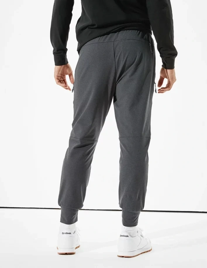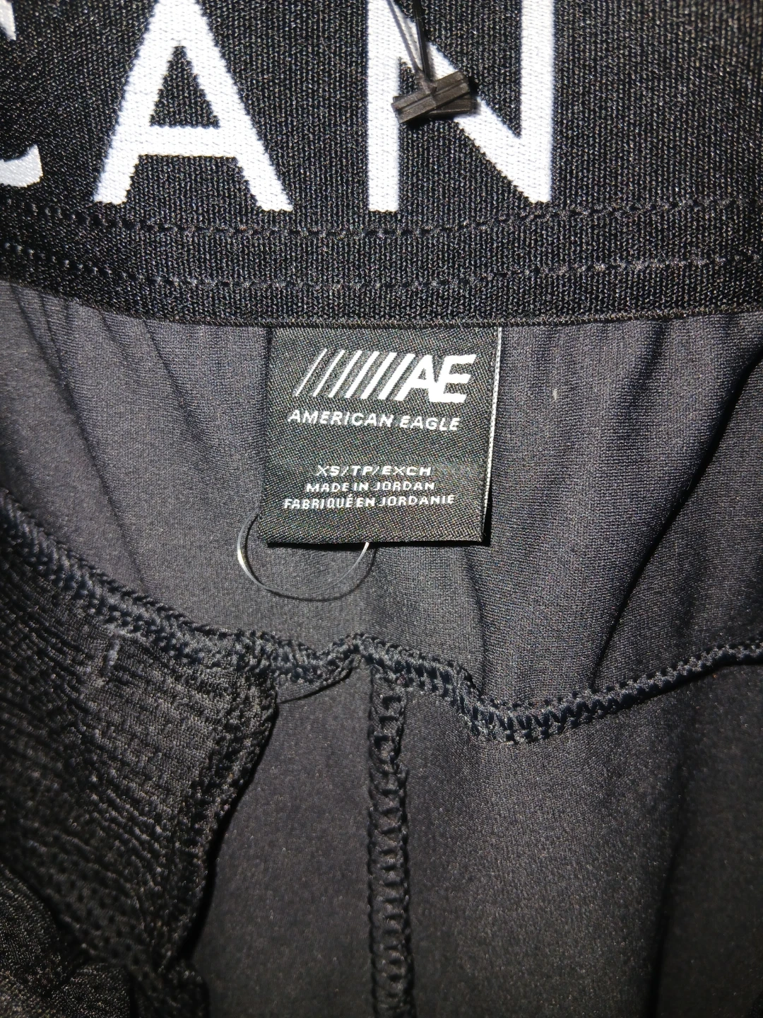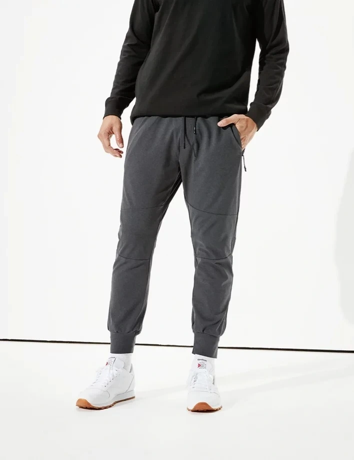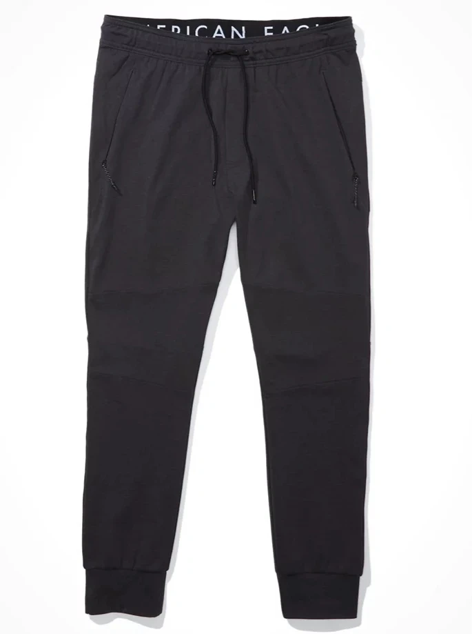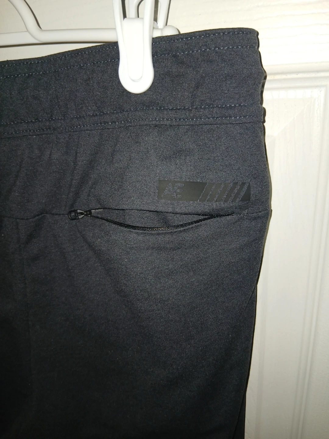 These are black joggers from American Eagle Outfitters. They're designed with a drawstring waist, zip pockets and elasticated cuffs for a snug fit.