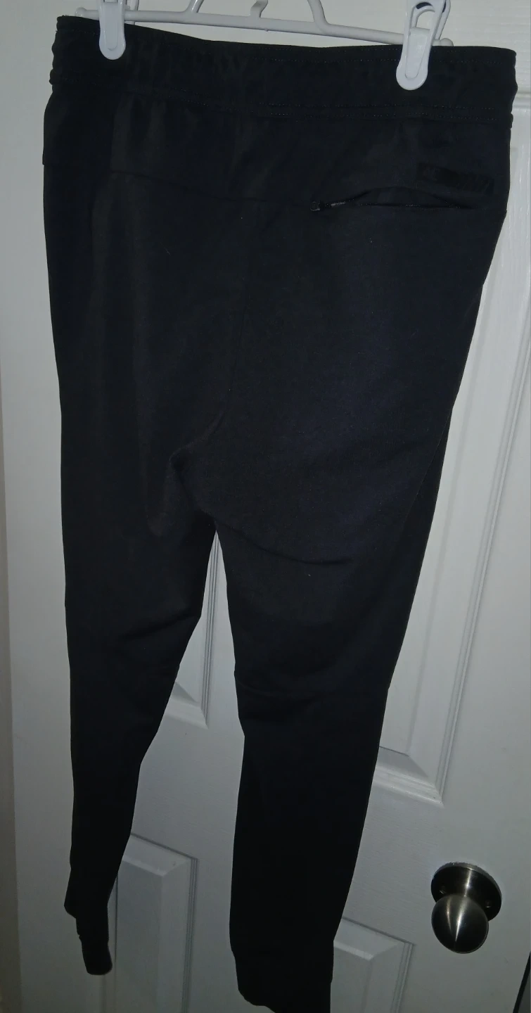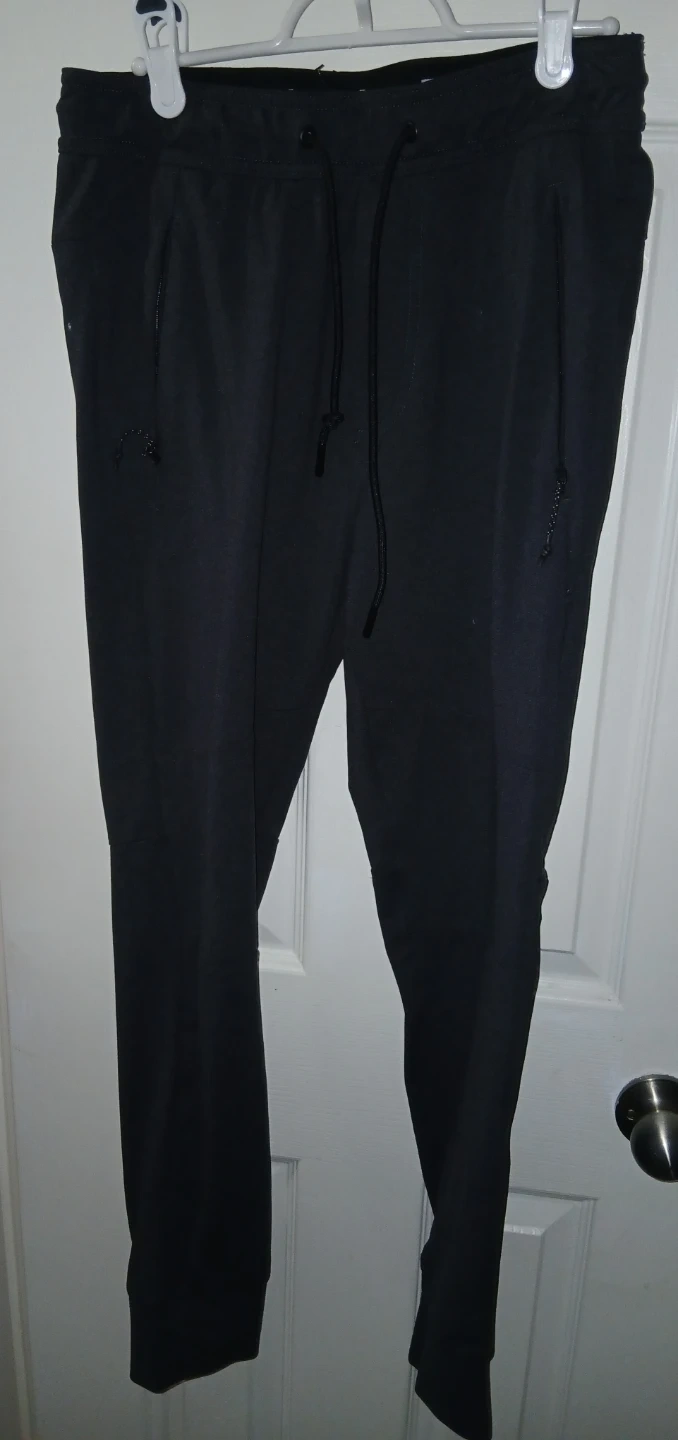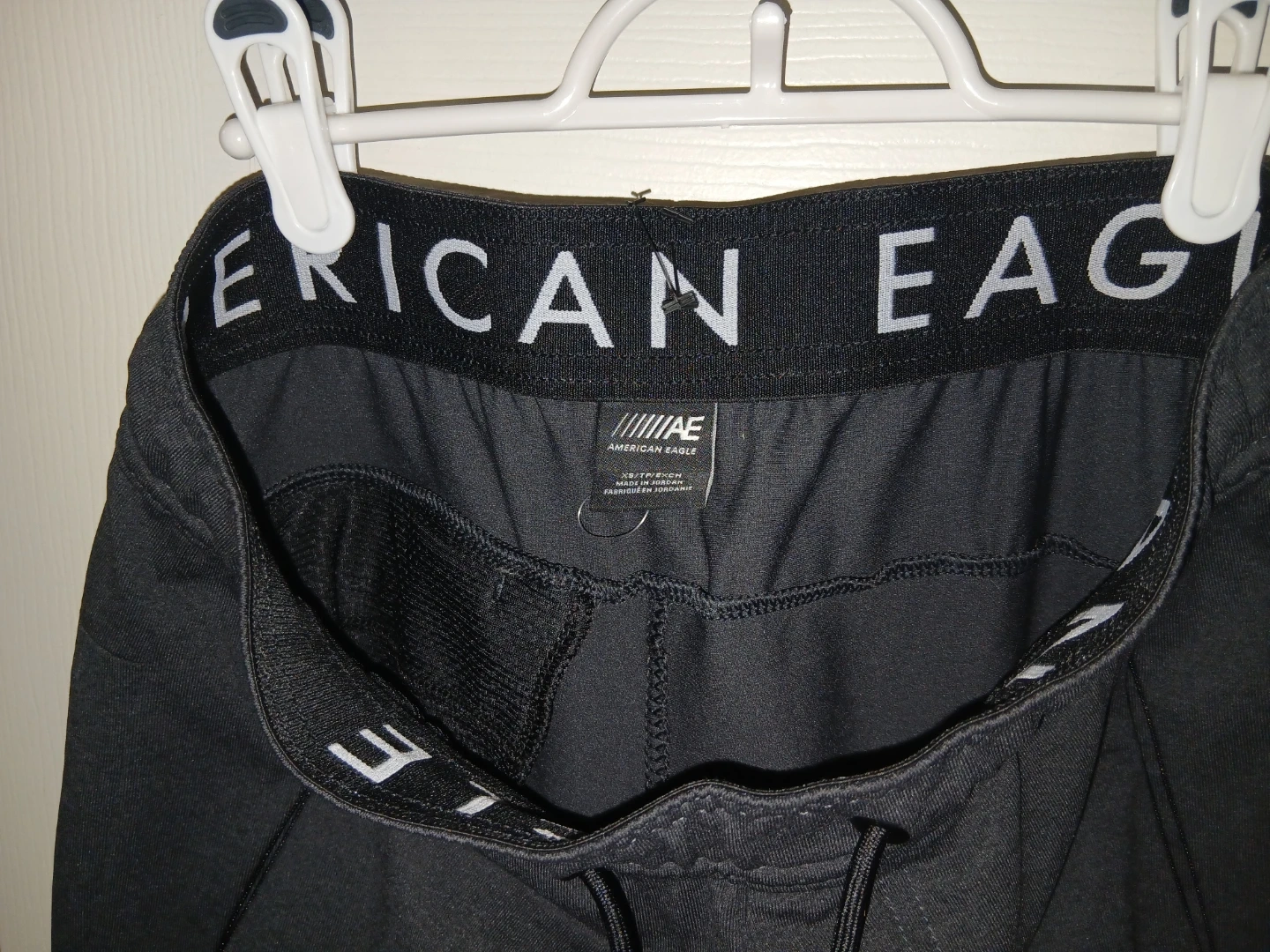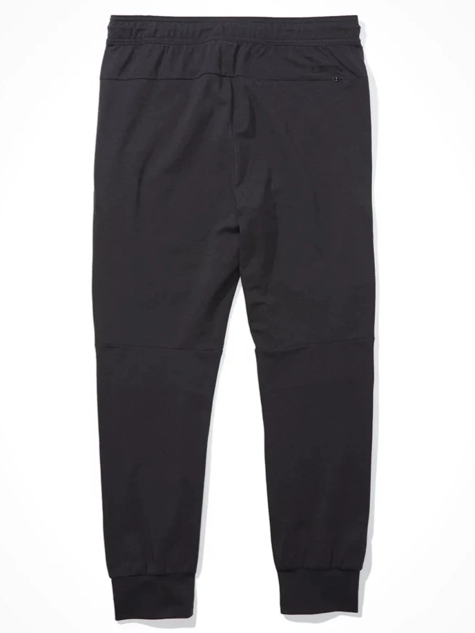 These are black joggers from American Eagle Outfitters. They're designed with a drawstring waist, zip pockets and elasticated cuffs for a snug fit.