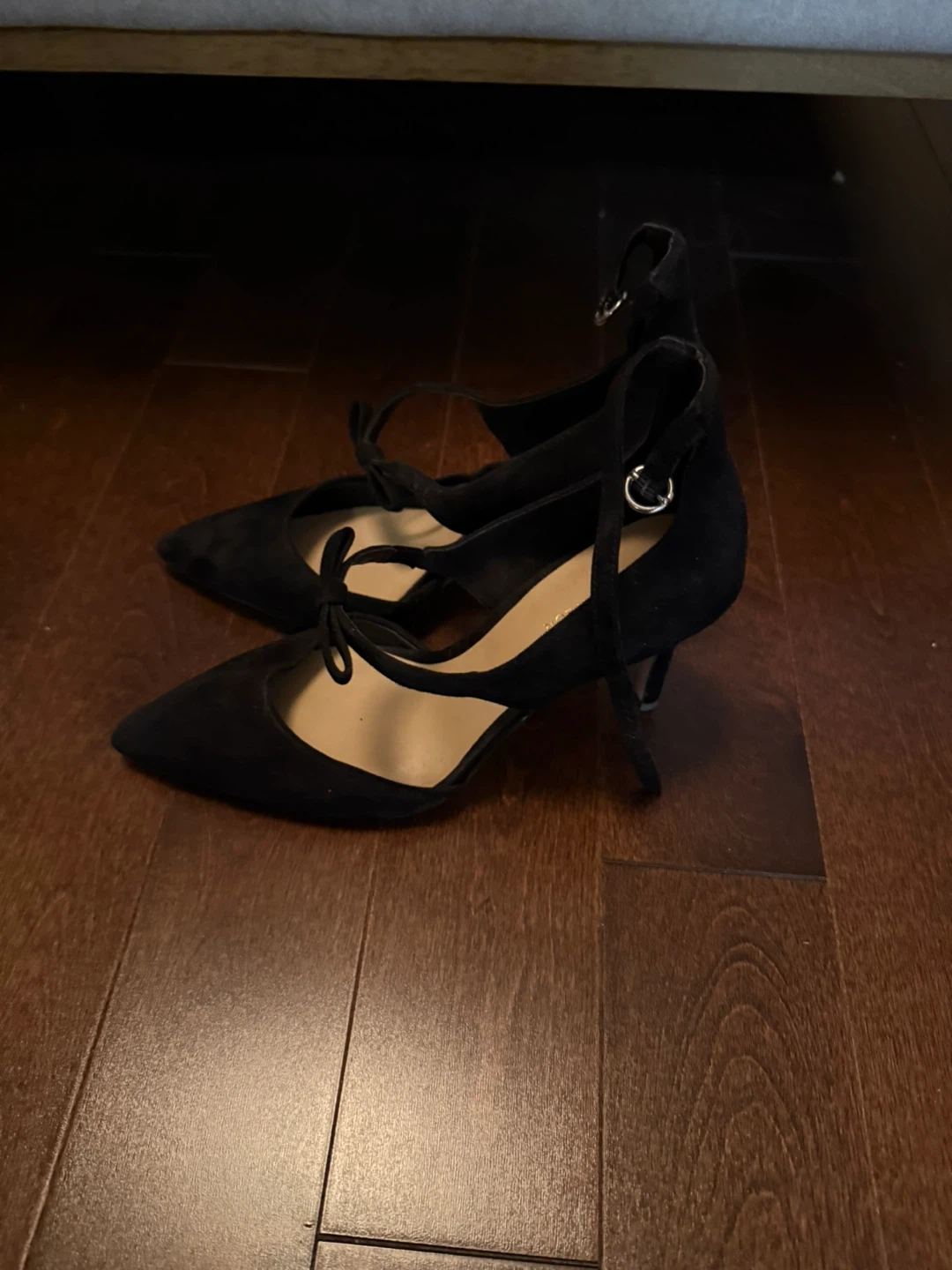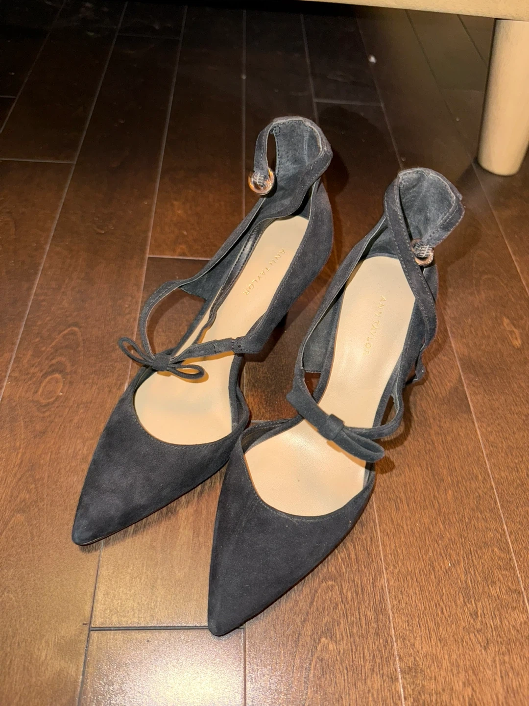10These are a pair of Ann Taylor black heels in size 6. They feature a stylish ankle strap and a pointed toe. Perfect for dressing up or a night out!