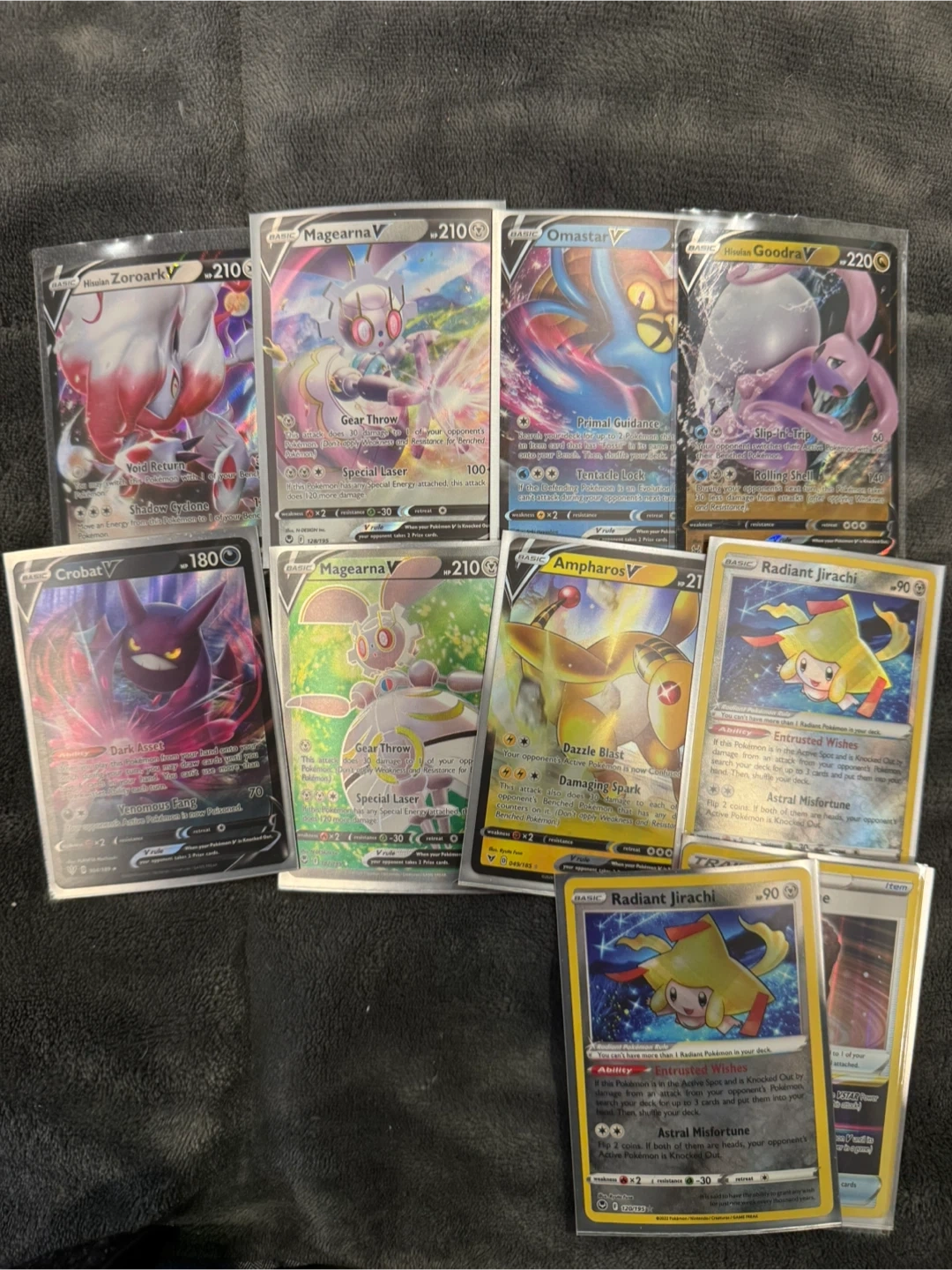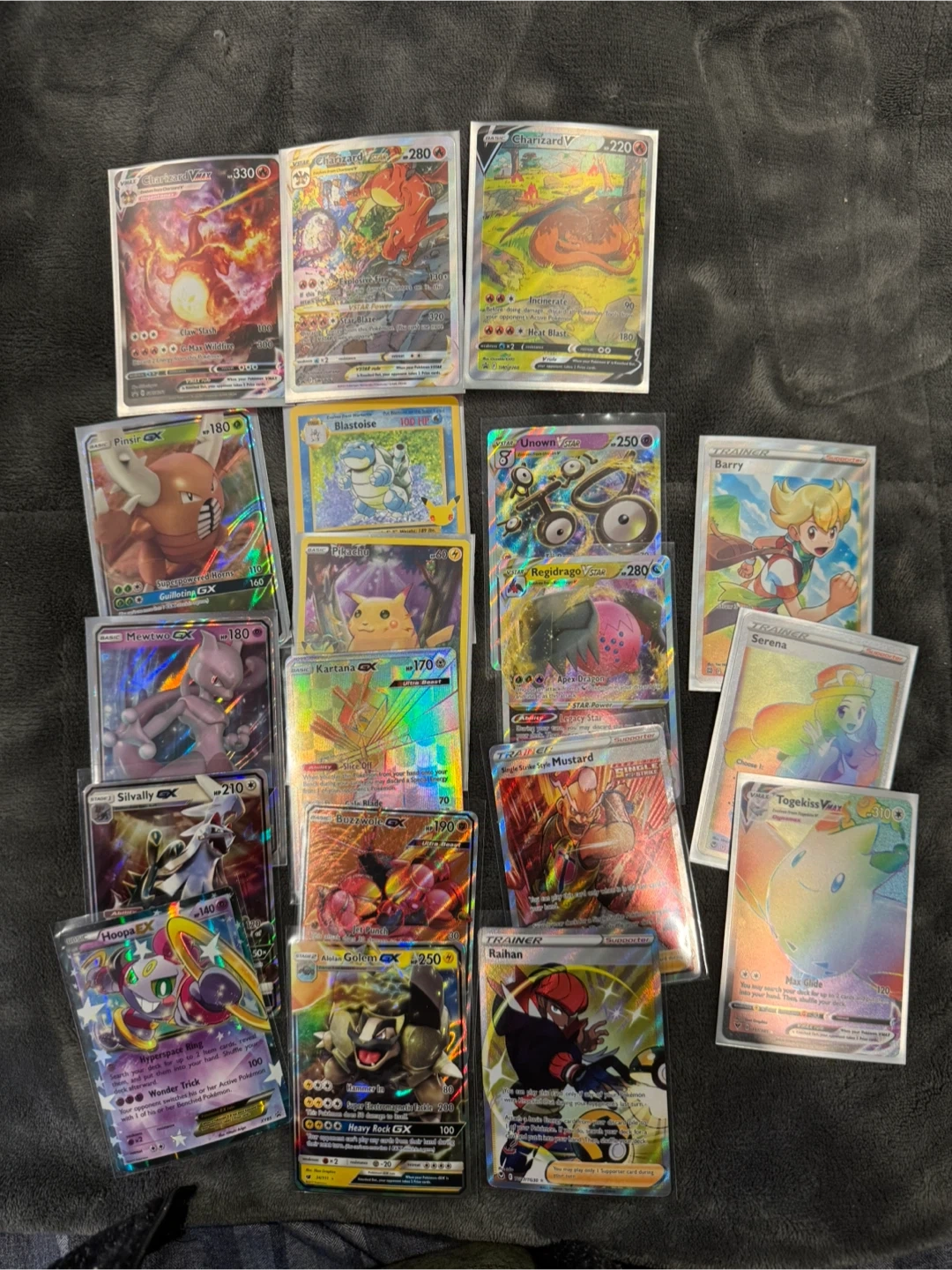 Collection of various Pokémon trading cards. Includes V, VMAX, and GX cards. These cards are perfect for collectors and players alike. All cards are in protective sleeves.