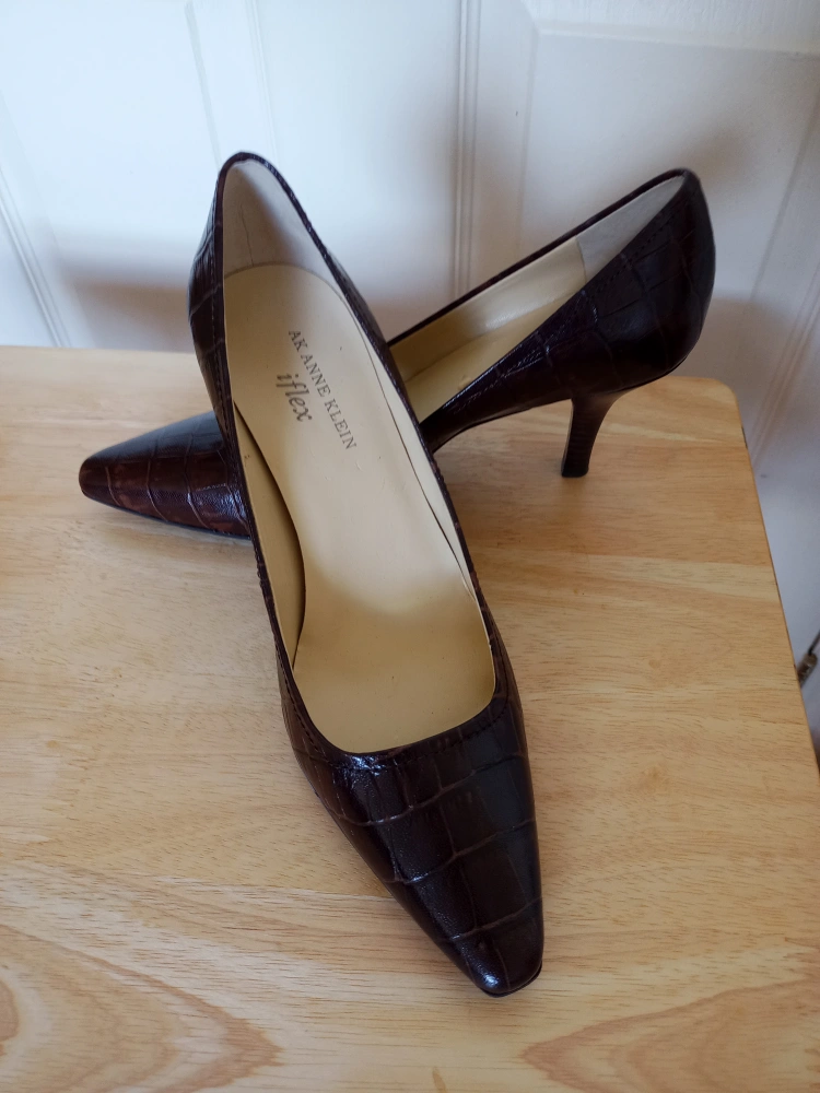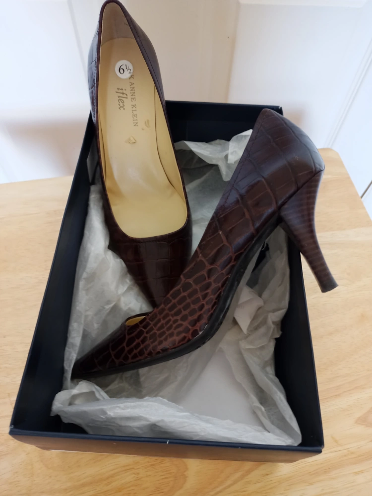 Selling a pair of Anne Klein heels in dark brown croco print! They are size 6.5 and come with the original box. worn once