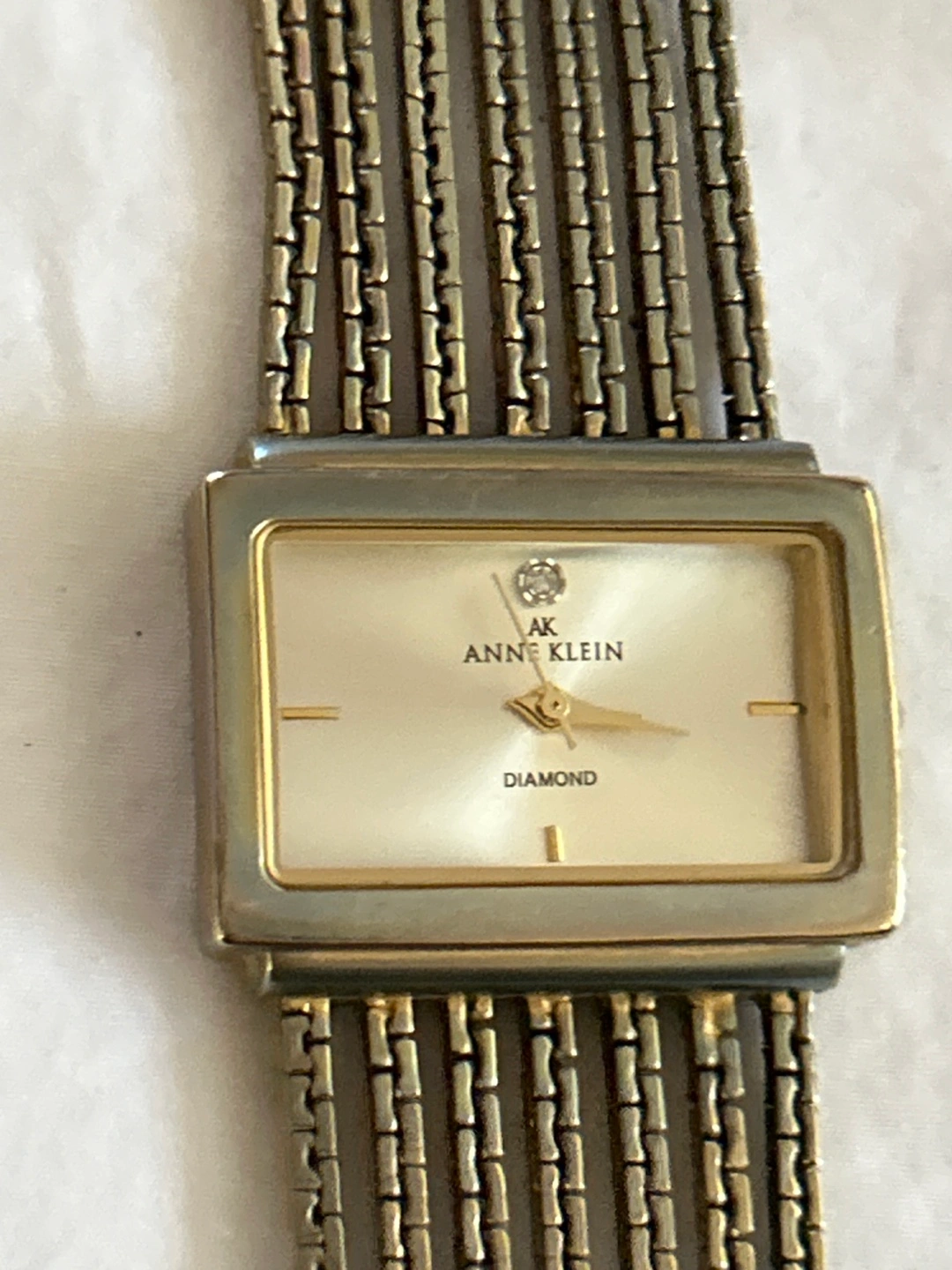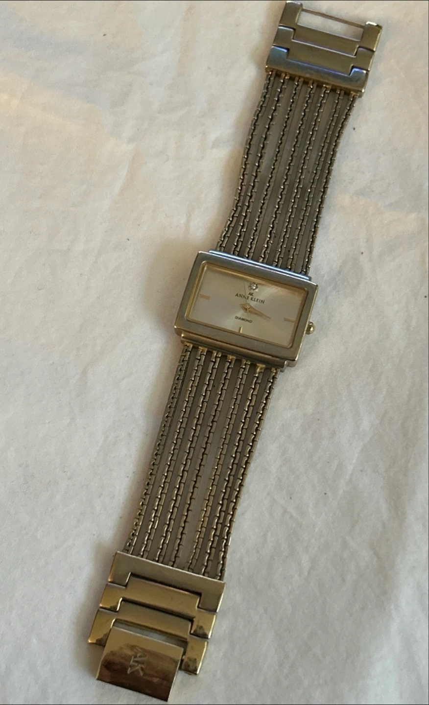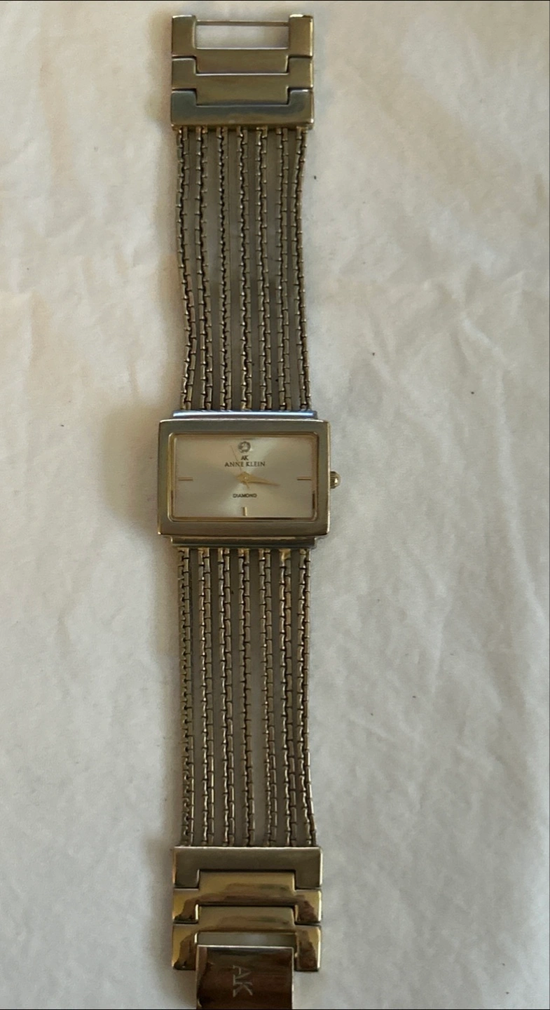 Selling a lovely vintage Anne Klein ladies watch with a diamond accent. The watch features a rectangular face and a multi-strand band. The back casing is stainless steel. It needs new battery. Sold as is. Cash and pick up only.
