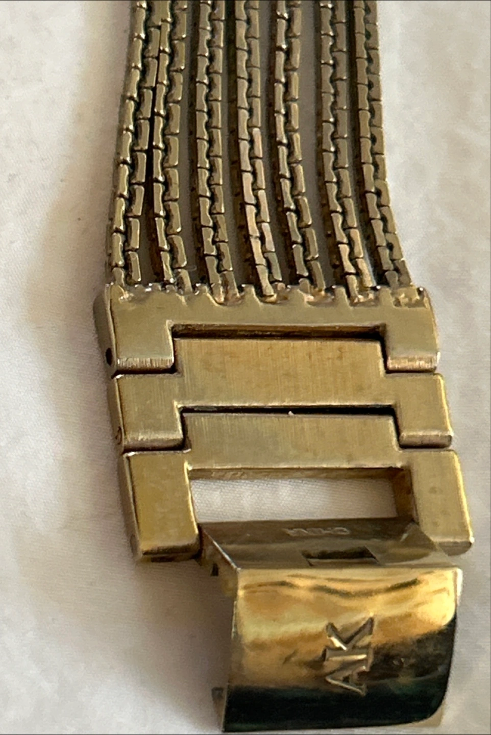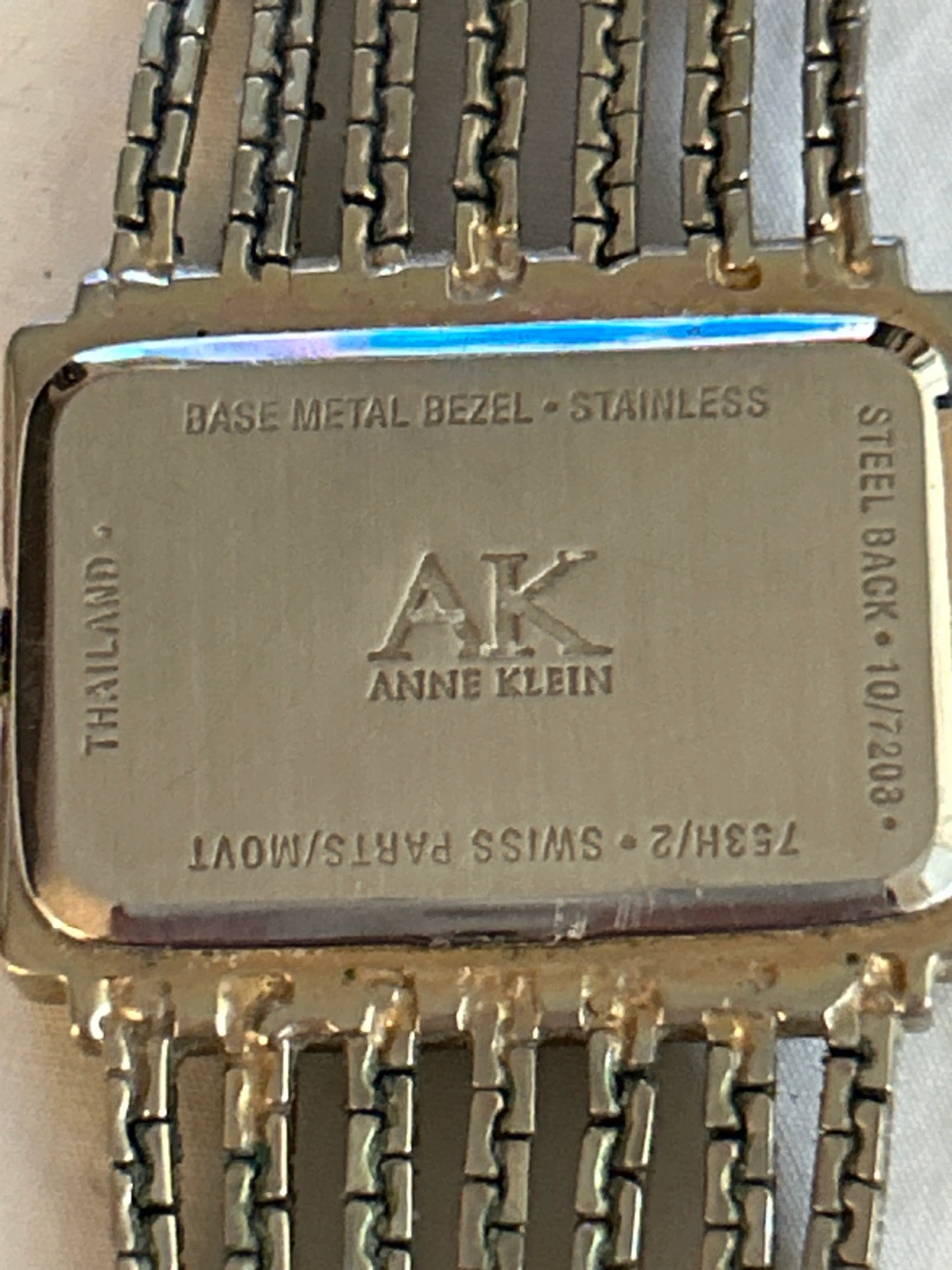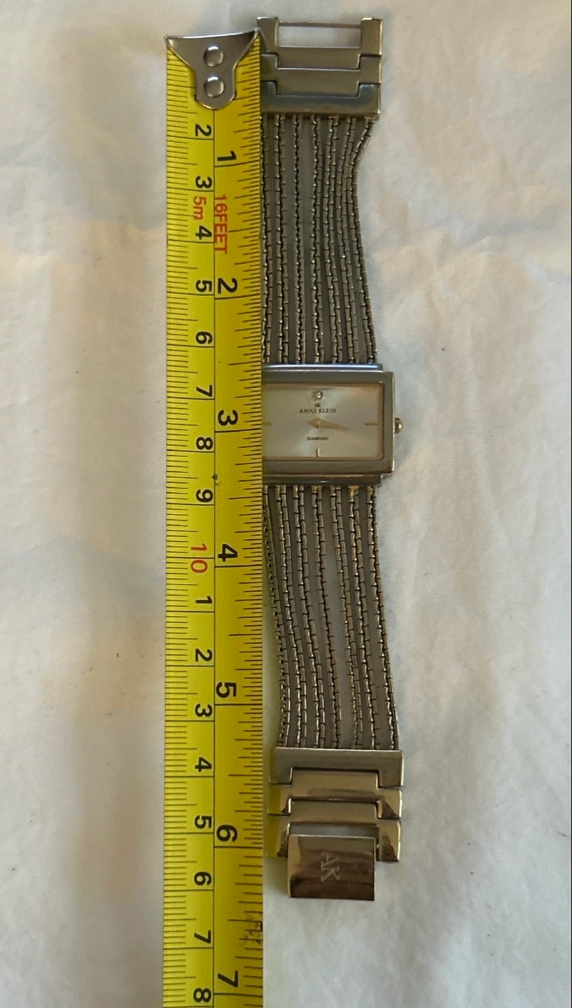 Selling a lovely vintage Anne Klein ladies watch with a diamond accent. The watch features a rectangular face and a multi-strand band. The back casing is stainless steel. It needs new battery. Sold as is. Cash and pick up only.