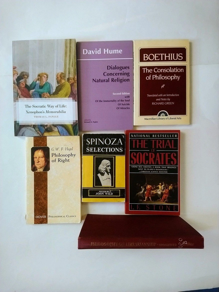 436Location: Yonge and College /downtown Toronto $7 each except Philosophy of Right. Cash only; prices are firm. - The Socratic Way of Life: Xenophon's Memorabilia - Thomas L. Pangle - Dialogues Concerning Natural Religion - David Hume - The Consolation of Philosophy - Boethius - Philosophy of Right - G.W. F. Hegel - $9 - Spinoza: Selections - The Trial of Socrates - I.F. Stone - Philosophy of Librarianship - A. Broadfield Feel free to check out my other book posts as well!