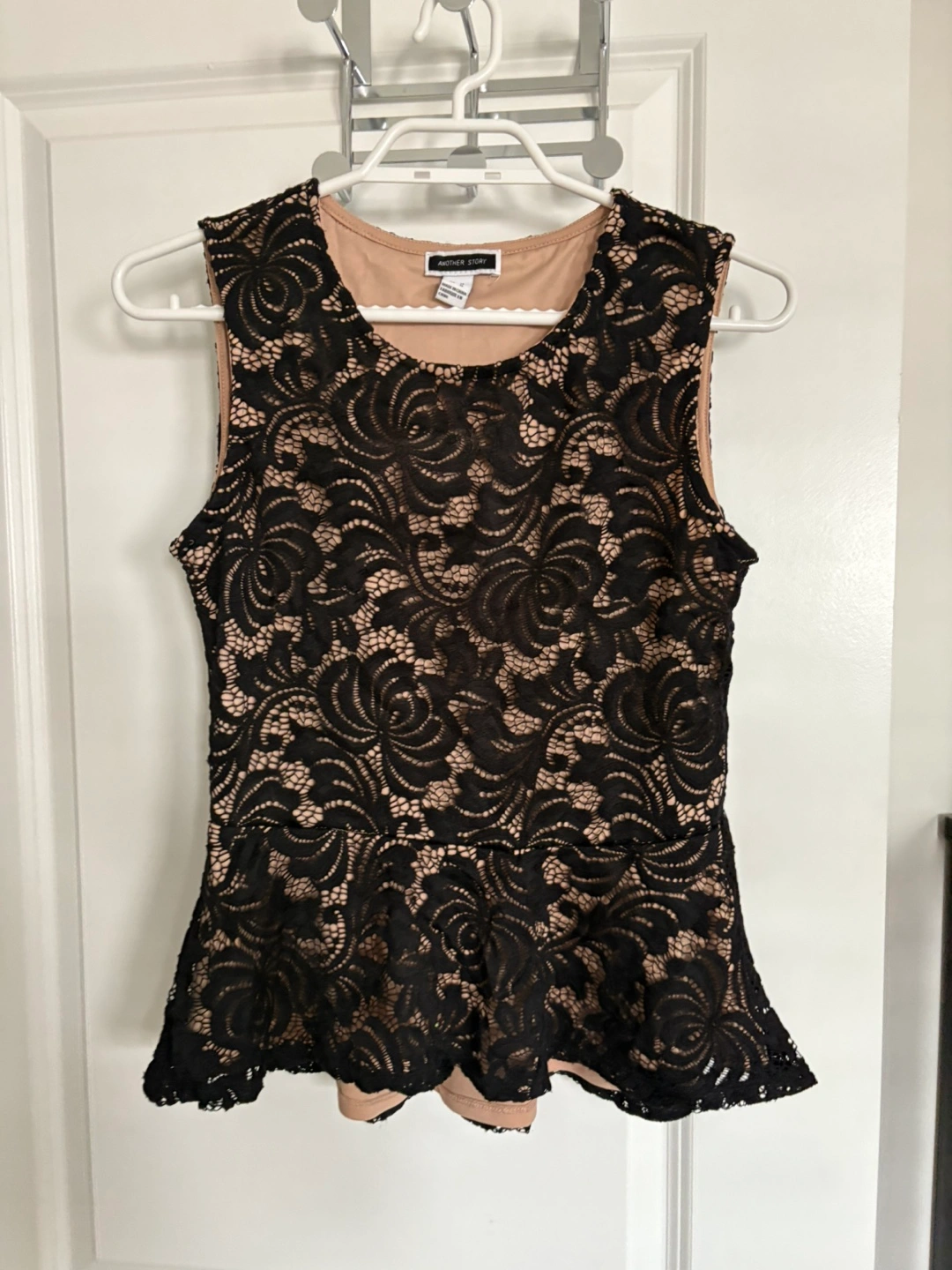 Selling a beautiful black lace peplum top from Another Story! It's in great condition and a size 12. The lace detailing is so pretty and the peplum style is super flattering. Perfect for dressing up or down!