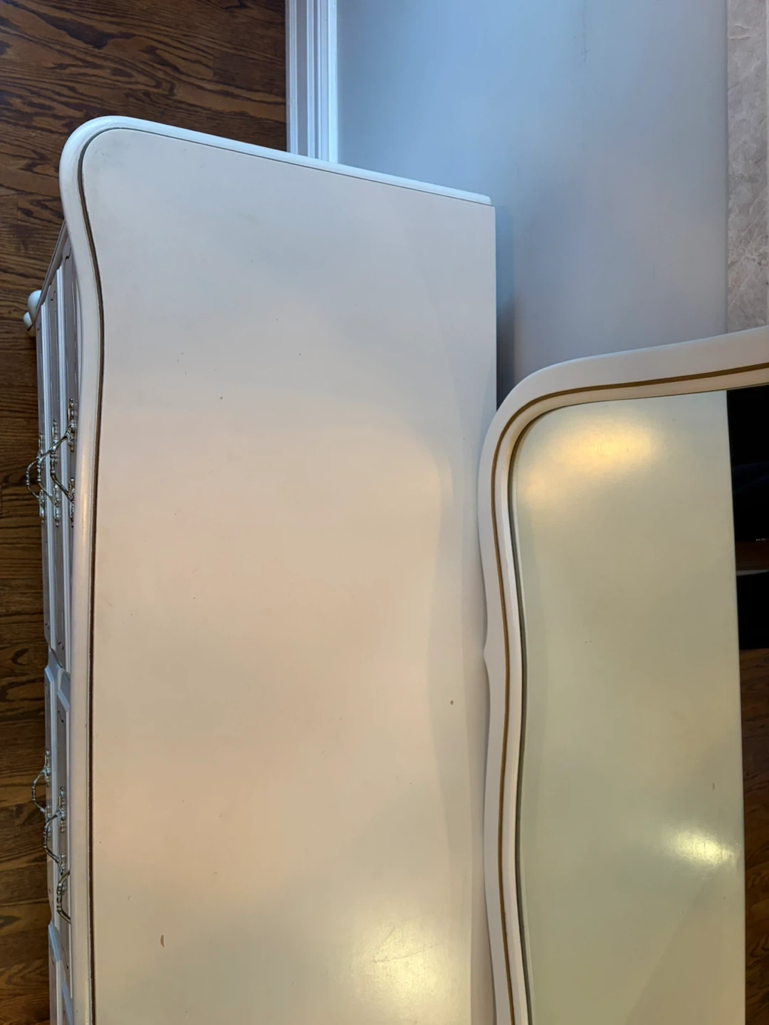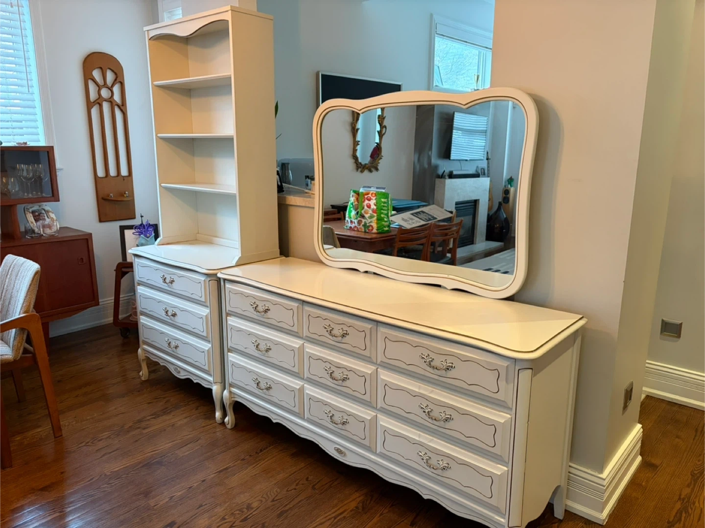 Original vintage Baronet complete bedroom set in the French Provincial style. Includes 2 twin beds (with rails), 2 nightstands, 1 dresser with large decorative mirror, 1 smaller dresser with matching hutch, and 1 lingerie chest. This 8-piece furniture set offers ample storage with multiple drawers. Definite signs of wear and tear as it is almost 40 years old but this Canadian brand is known for its solid maple wood, high-end construction. Can easily sand top and repaint. Great for two sisters sharing a bedroom.