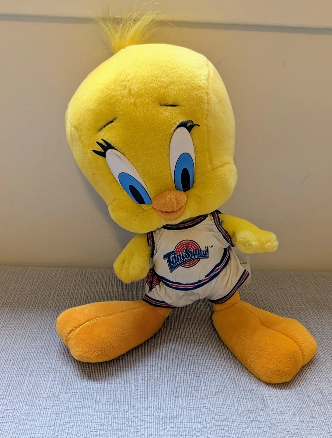 This is a Warner Bros. Tweety Bird plush toy from 1996. It's made with new polyester fibres and synthetic fibre fill. The plush measures approximately 12 inches tall.