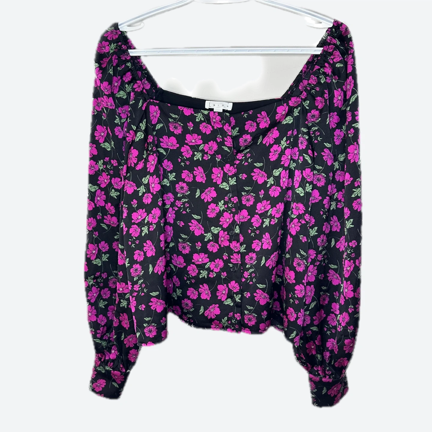This is an Anthropologie Leith floral blouse in size L. It features a square neckline and long sleeves with elastic cuffs. The blouse has a black background with pink floral pattern - Floral print - Lined - Elasticized neckline - Square neckline - Bishop sleeve Condition : Preowned. Good condition. Lightly worn. No stain. No holes. Brand : Anthropologie Leith Market : Women Size : Large Colour : Red Black Style : Square Neck Fit : Slim Measurements : Pit to pit : 19.25 inch Sleeve : 25.5 inch Length from neck base to hem : 21.5 inch Contents : 100% Polyester