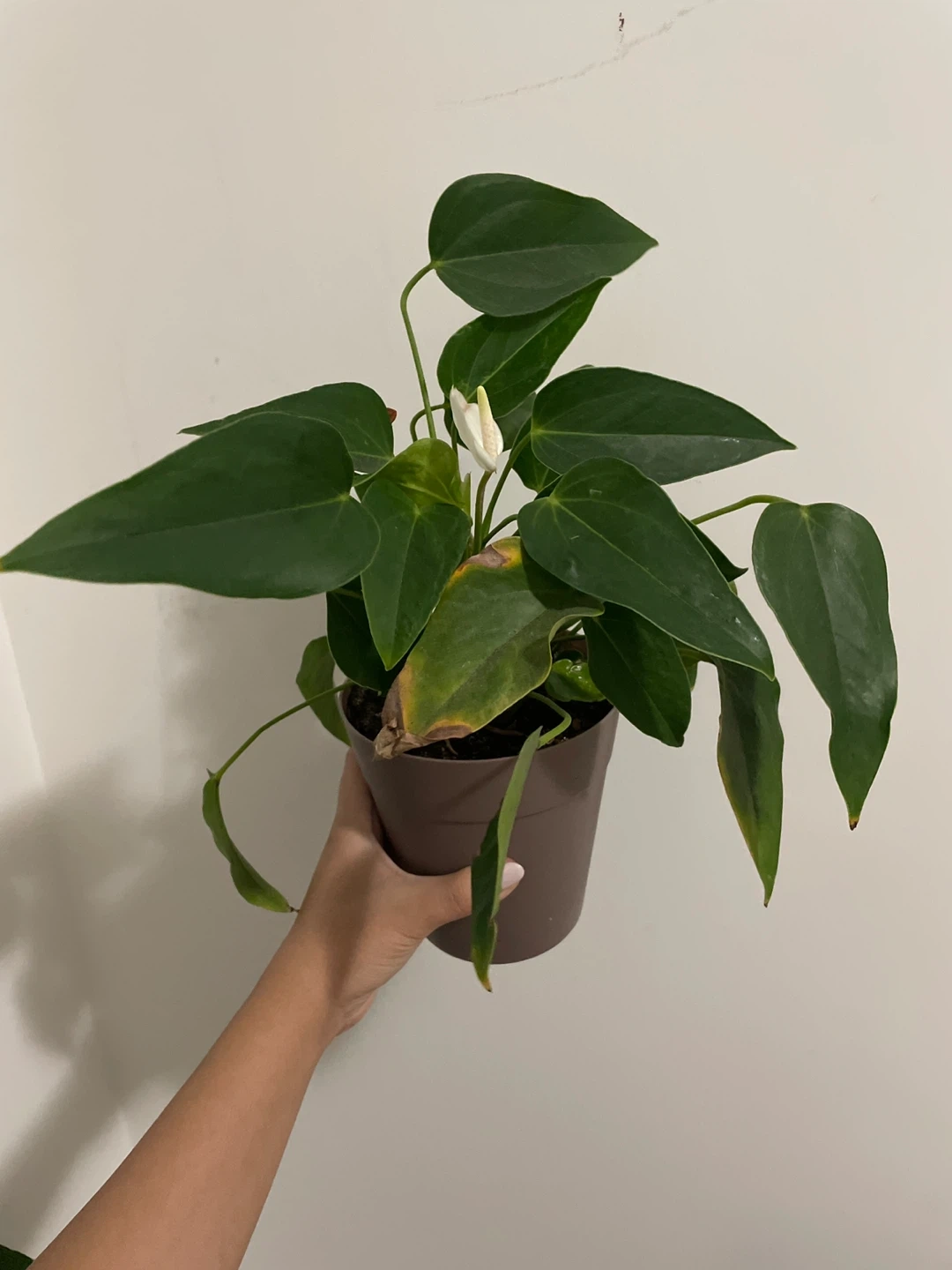 85Selling an Anthurium plant in a brown pot. Some leaves show signs of aging!