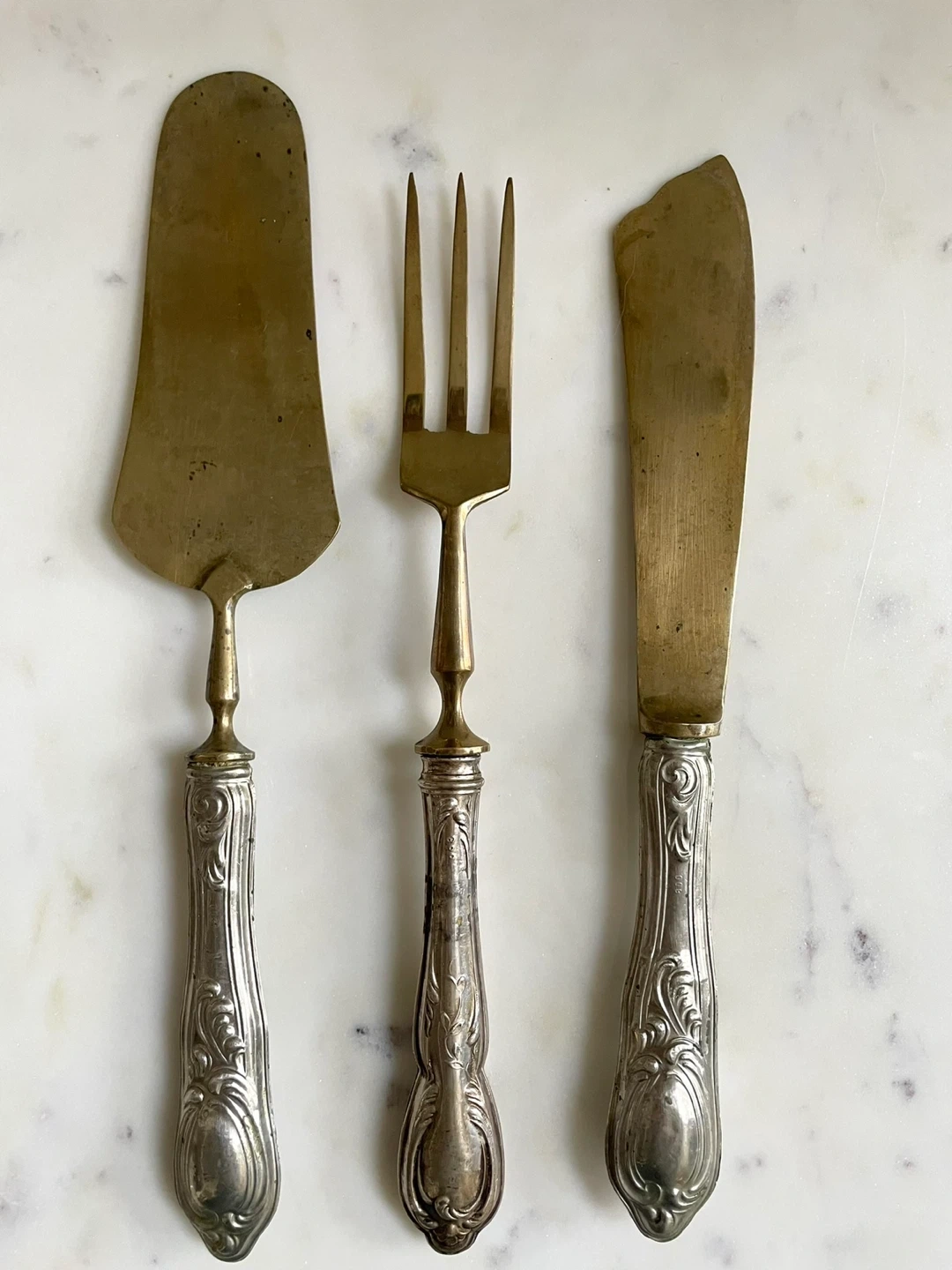 71Elegant Antique Silver Dessert Service Set - 3 piece. Antique ‘Solingen’ 800 Silver set 1900-1940’s - made in Germany Handle stamped 800 (80%) silver See pictures for size and weight. Stunning, unique 3 piece set to add to your vintage collection Reasonable offers accepted🤍 As these are Antique/used, there are signs of wear and tarnish, which add to their unique character and charm. Perfect for collectors or anyone who appreciates fine silverware! * Brand: Solingen * Material: Silver 800, Gold-toned blades & fork ending * Quantity: 3 * Origin: Germany