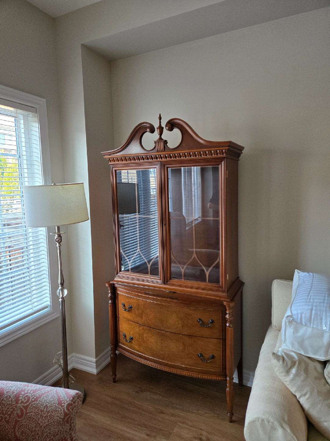 Selling a beautiful antique china cabinet. It features a classic design with a wooden frame, glass doors, and drawers for storage. Perfect for displaying your cherished items and adding a touch of elegance to your home!