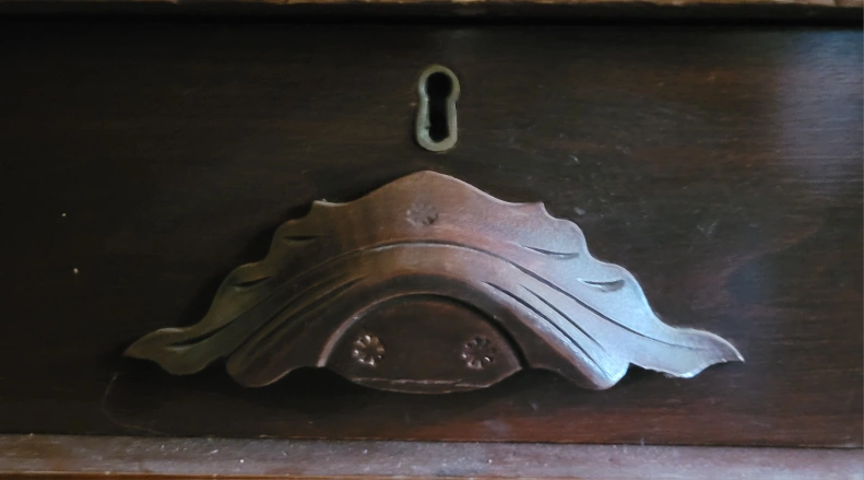 Selling an antique wooden dresser with a lovely brown finish It has several drawers for ample storage Perfect for adding a vintage touch to your home. Bonnet Dresser approximately made 1870 Dove tailed drawers 48 x 49 x 23 inches 9" Backboard