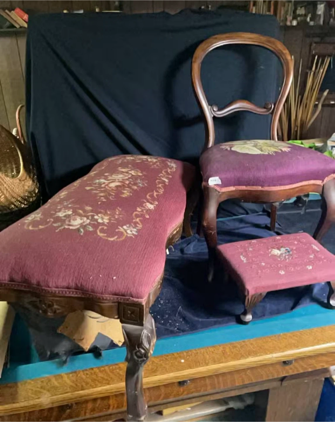 97This antique chair set features a tapestry chair, footstool, and piano stool, showcasing ornate wood carvings and tapestry upholstery, perfect for adding vintage charm to any room. As seen in the pictures, these items are in used condition, which contributes to their antique aesthetic.