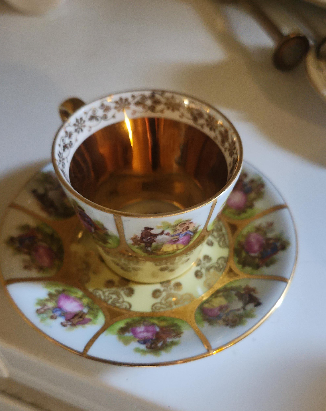 Selling a beautiful antique cup and saucer set. It features a delicate design with gold accents and charming scenes around the cup and saucer. Perfect for collectors or anyone who appreciates vintage elegance!