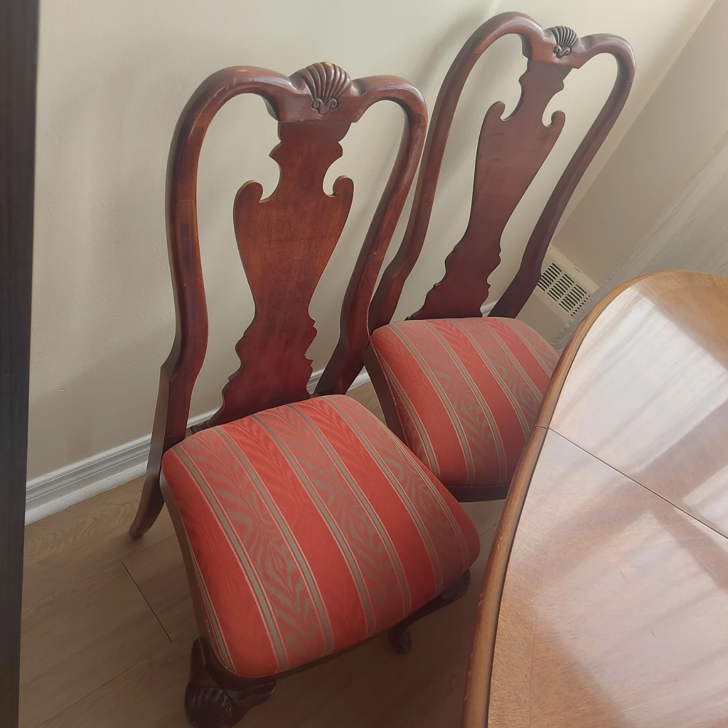 211Selling a beautiful antique dining table with four matching chairs. The set features intricate carved details and a warm, reddish-brown finish. The chairs have striped, upholstered seats. Perfect for adding a touch of vintage charm to your dining room!