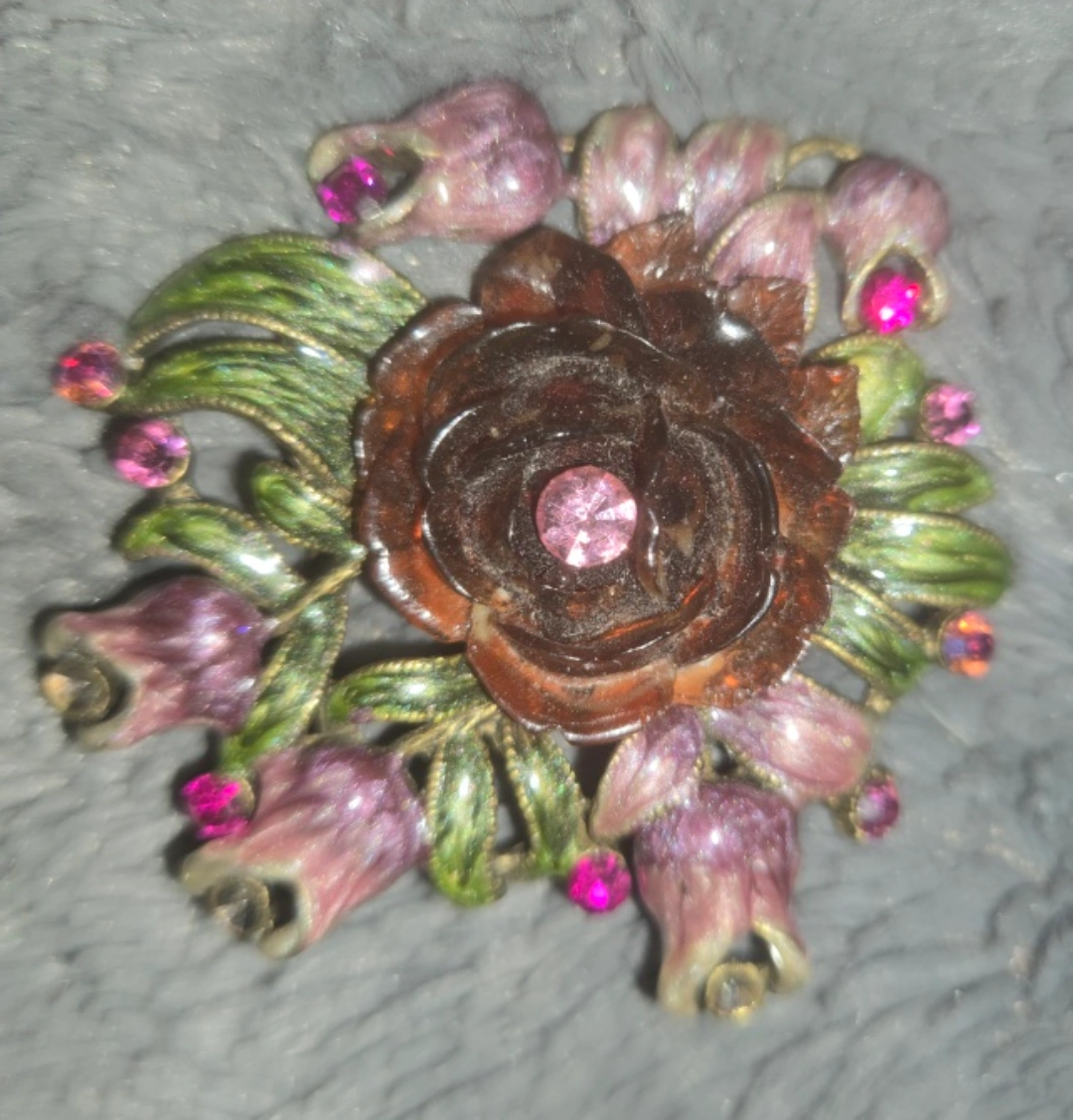 This is a lovely floral brooch featuring a dark brown rose surrounded by pink and green rhinestone accents. It's in great new condition and would add a touch of elegance to any outfit