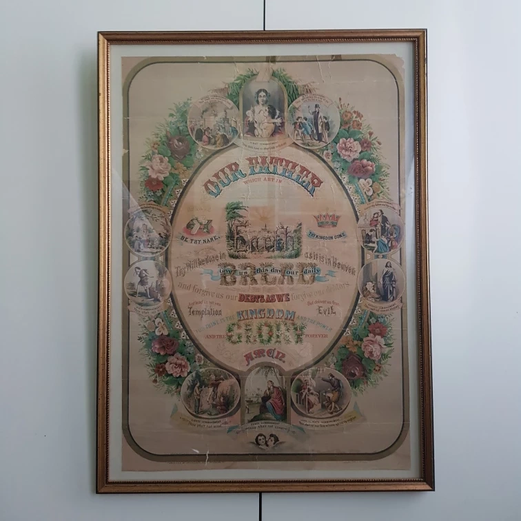 Vintage framed print of the Lord's Prayer bordered by the Ten Commandments. Features colourful illustrations and floral accents. Shows some age and wear. 16.5 × 22.5 inch Pets free, smoke free home Cash only Pickup near or at Cornell Public Library, or Delivery to Markham, Pickering, or Stouffville
