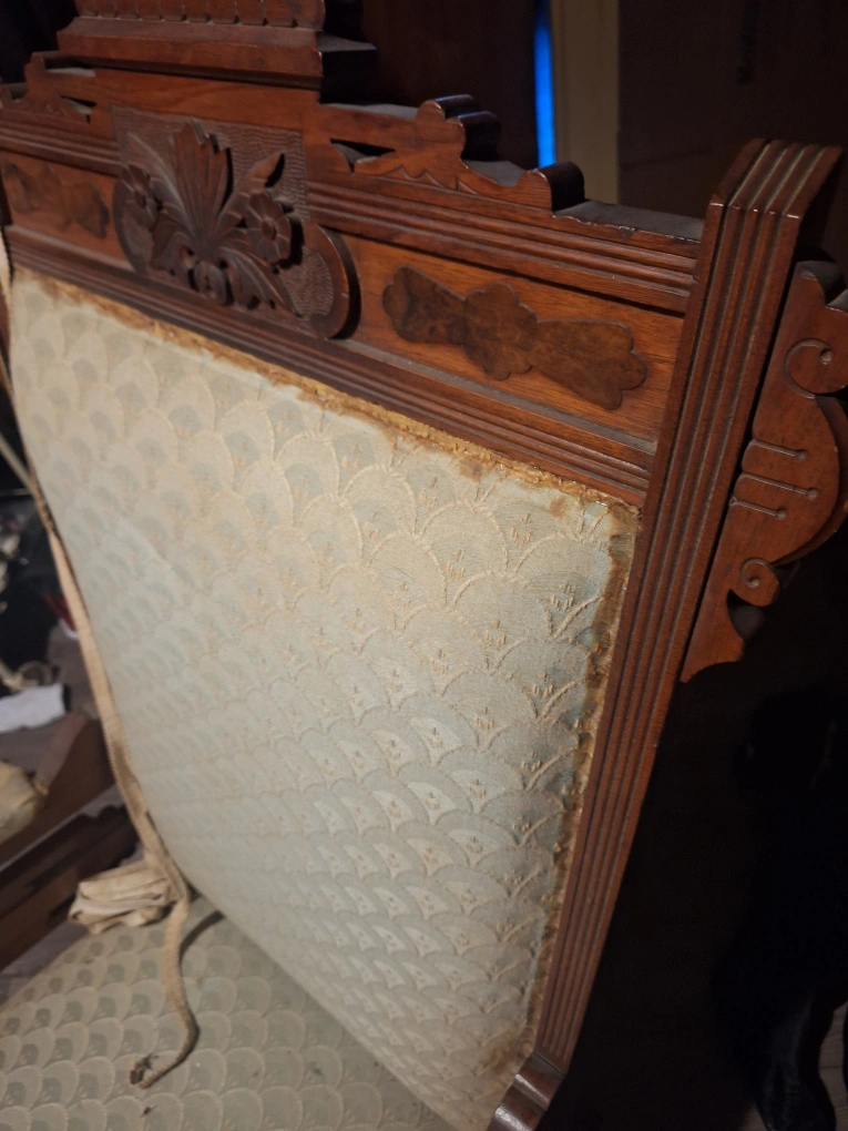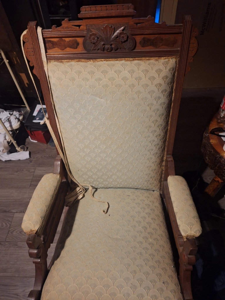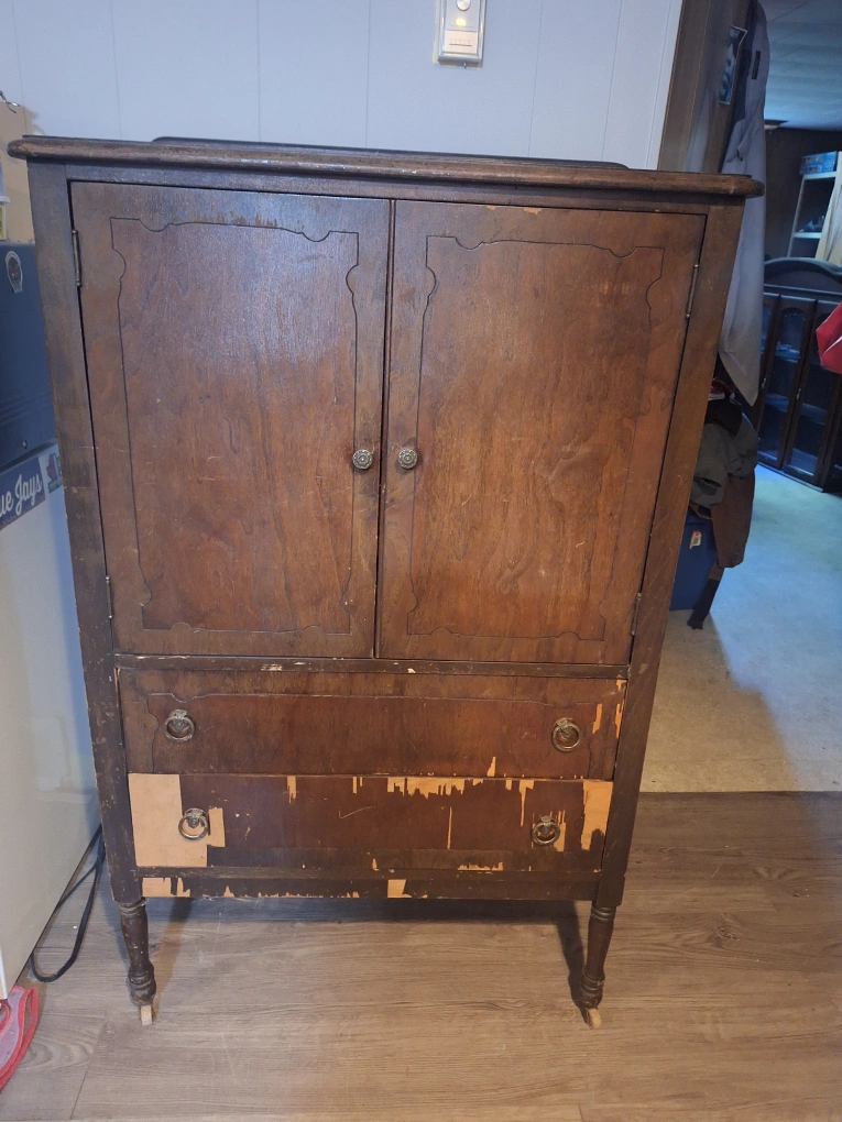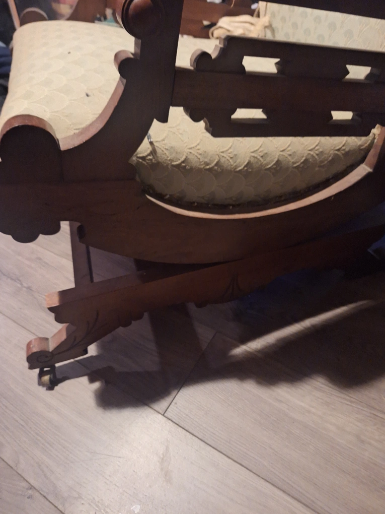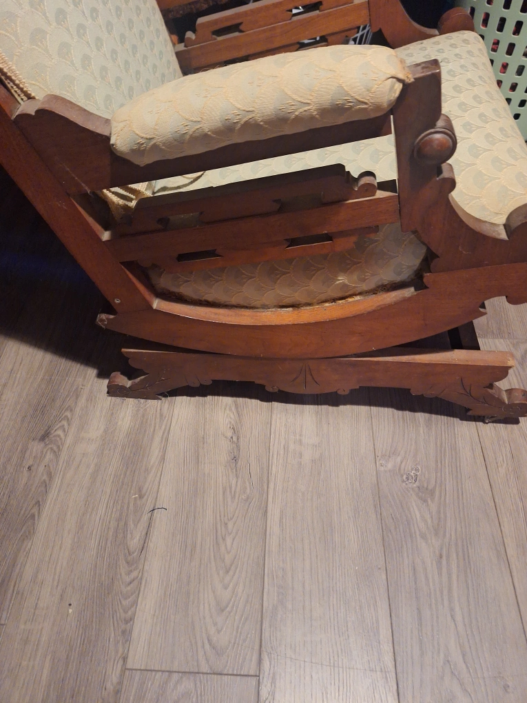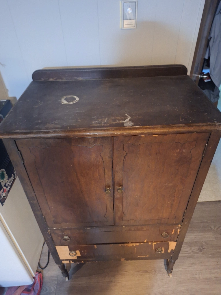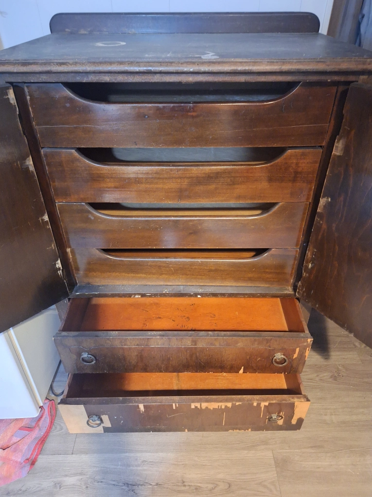 Pink bedroom set with vanity, dresser, bed frame, and mattress