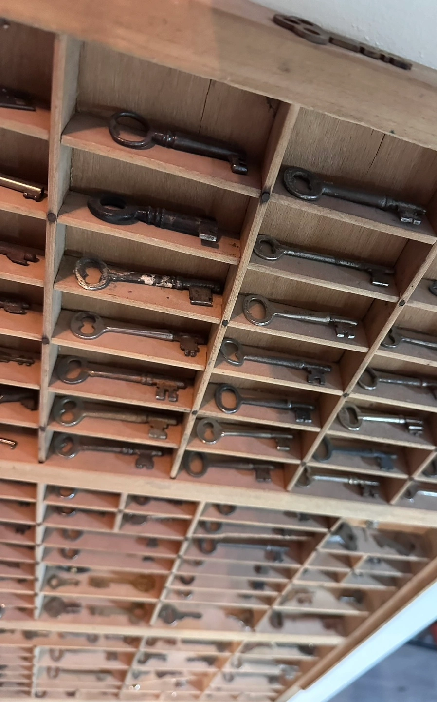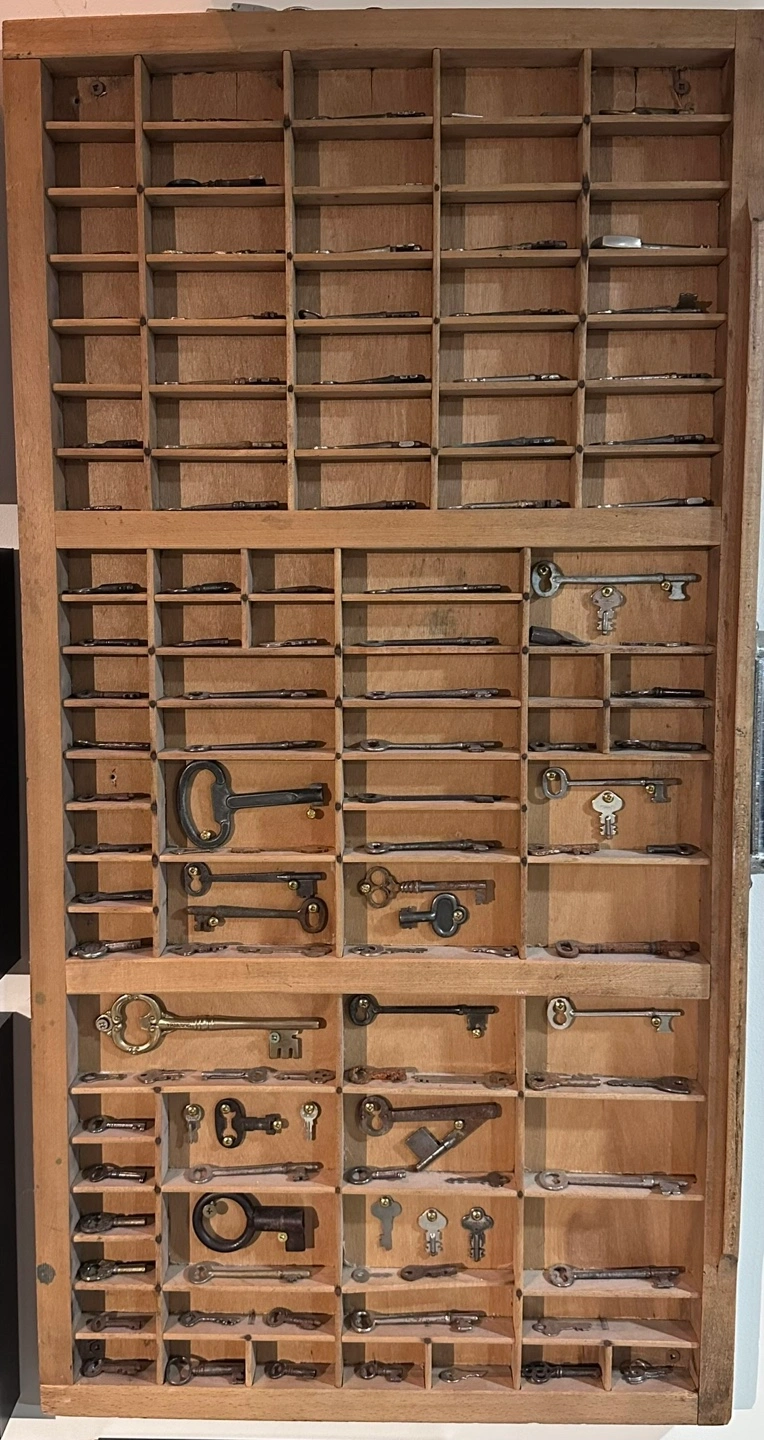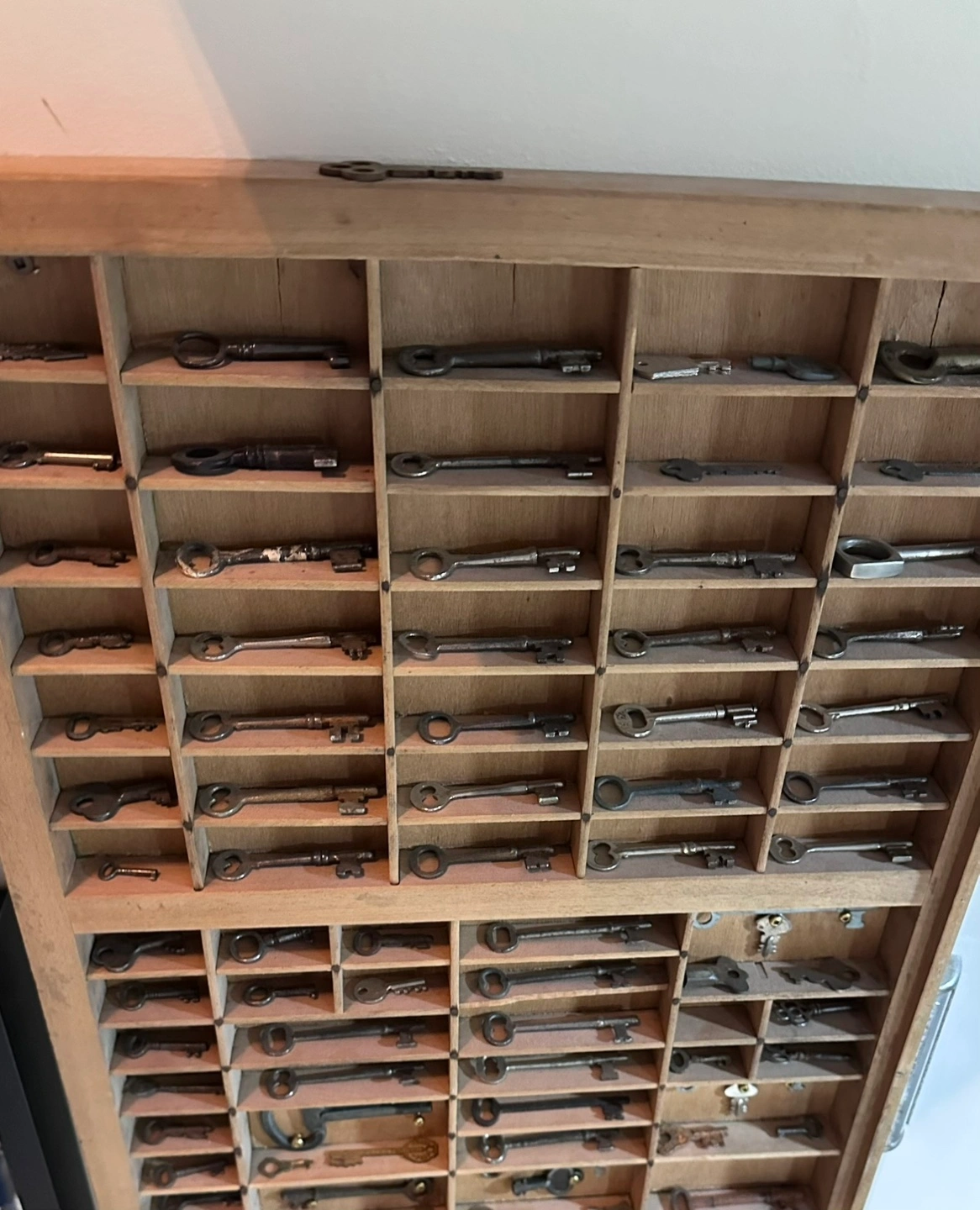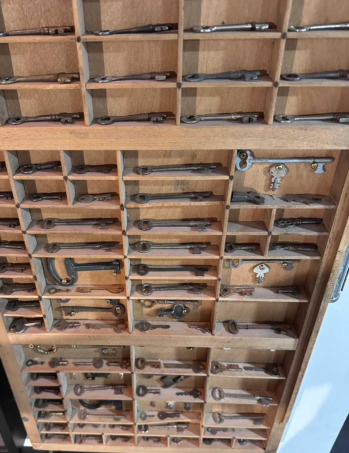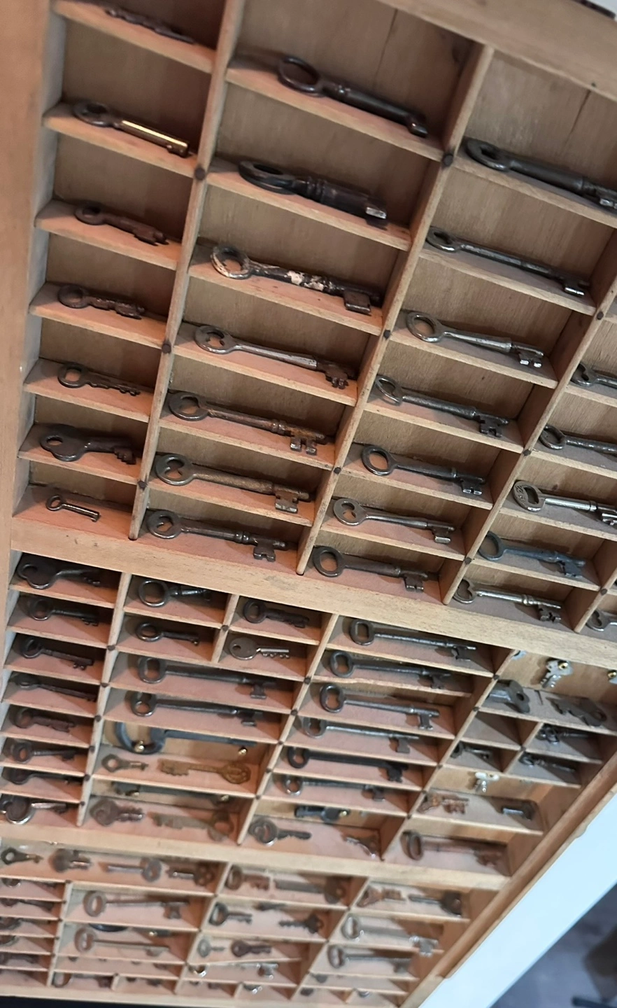 Large collection of antique keys. Various styles and sizes. Housed in a vintage printers drawer. $300