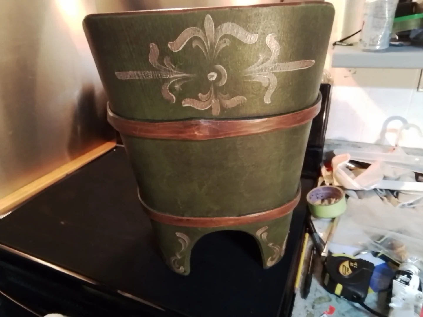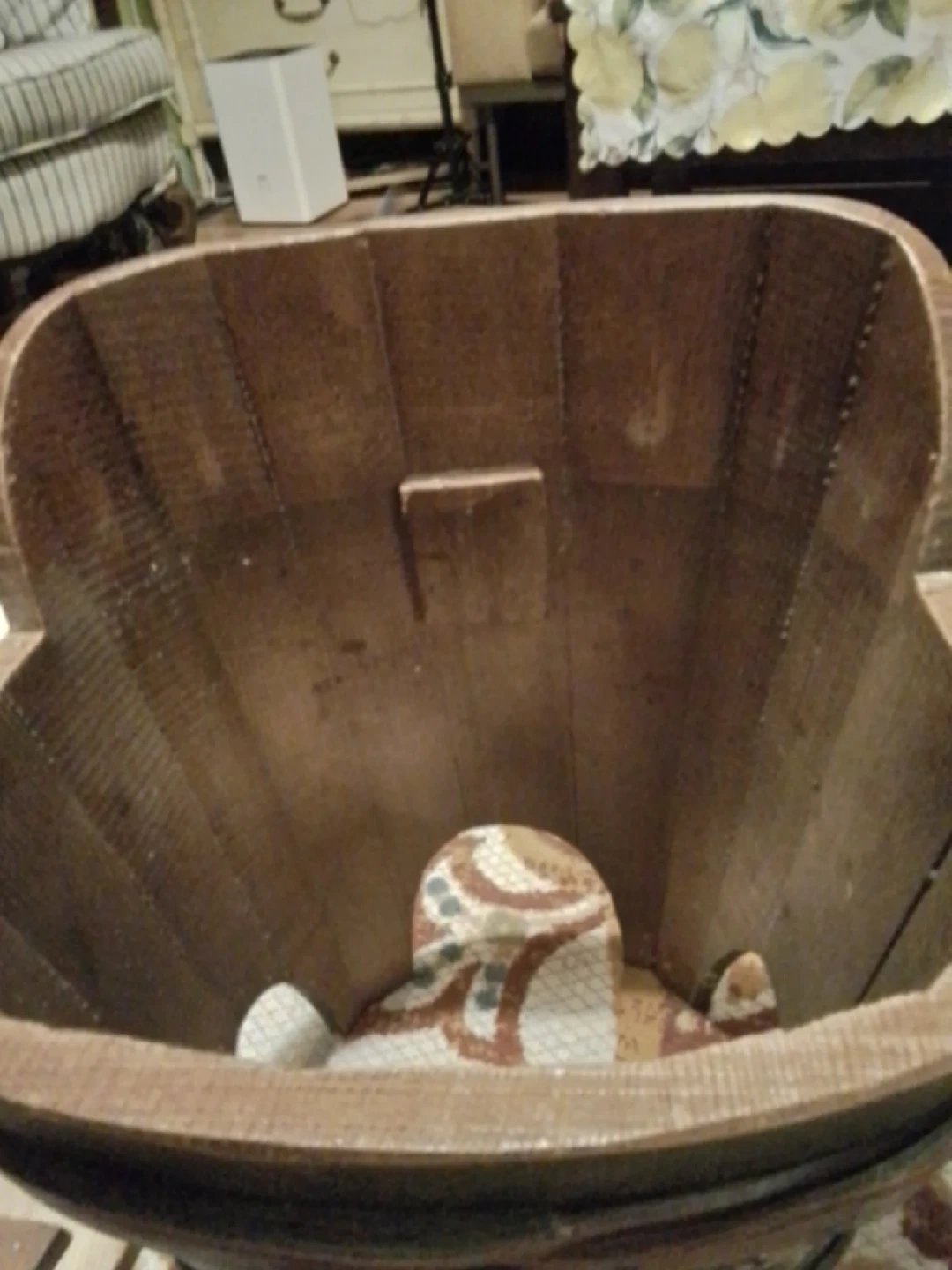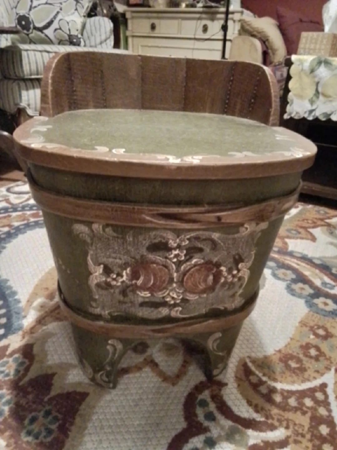 114Antique Norway Rosemaling Kibbles Chair This is a charming, antique Norway Rosemaling kibbles chair, perfect as a unique accent piece. Given its age, it does show signs of wear, which only adds to its vintage appeal. It's a delightful conversation starter and a functional item all in one! Antique Norwegian Rosemaling kibbles chair with hand-painted floral and fruit motifs in red, orange, white, and gold over green ground. Constructed in wood with arched cutout base, short legs, and fitted lid. H: 47 cm, W: 31 cm, Country of Origin: Norway Estimate 150.00 - 300.00 USD If the ad is up, the chair is available! Don't miss out on this piece of history! Pickup at Yonge Street and Steels Avenue