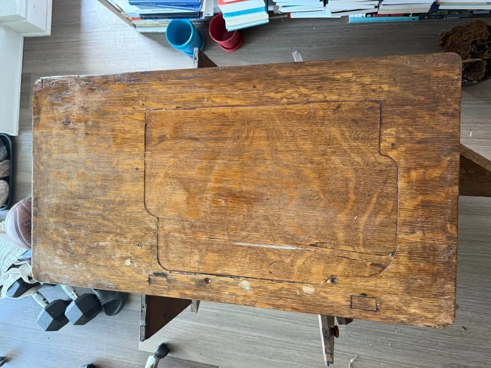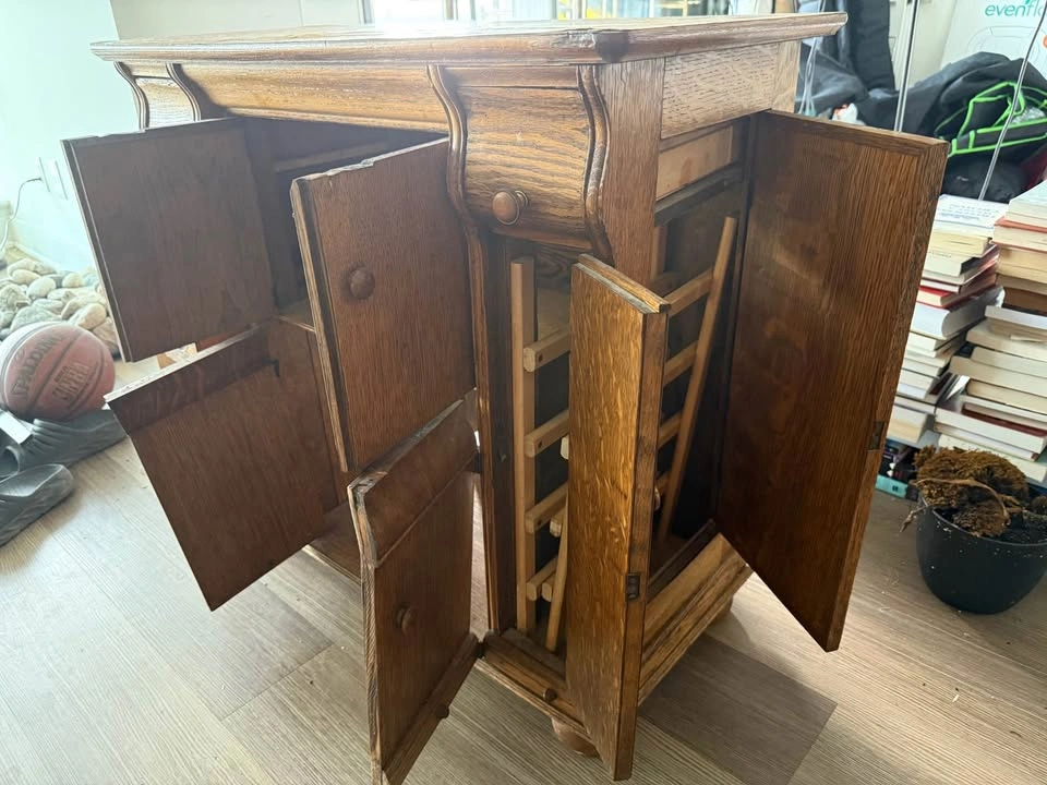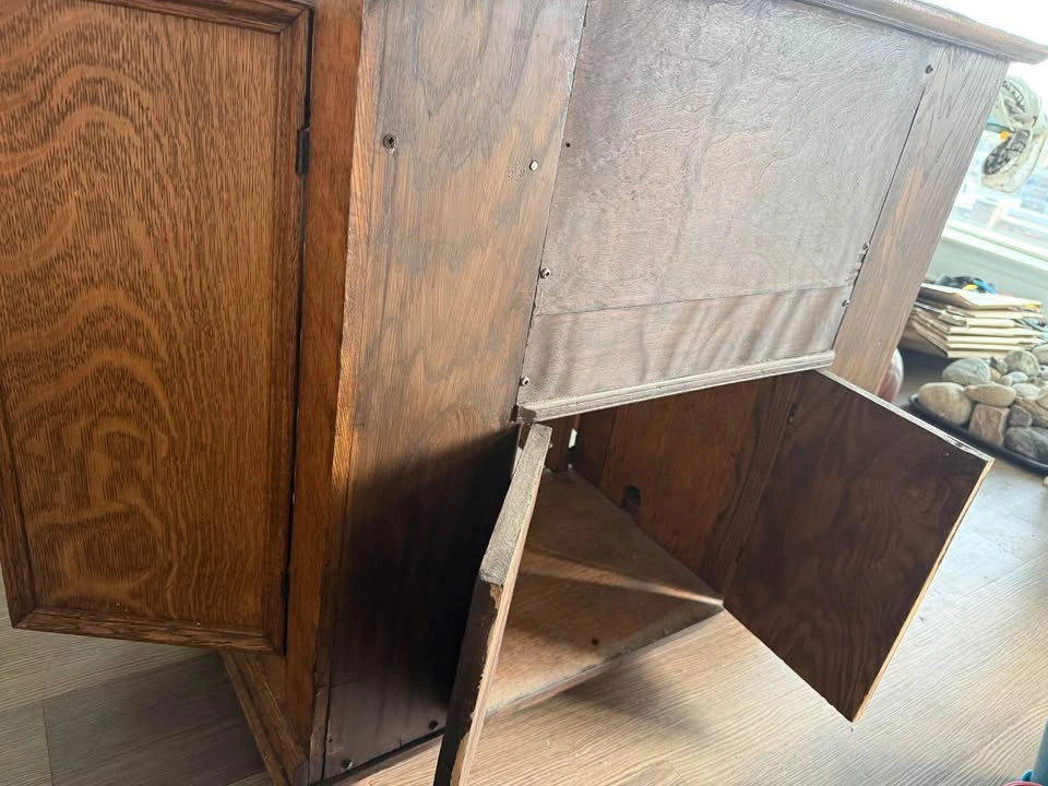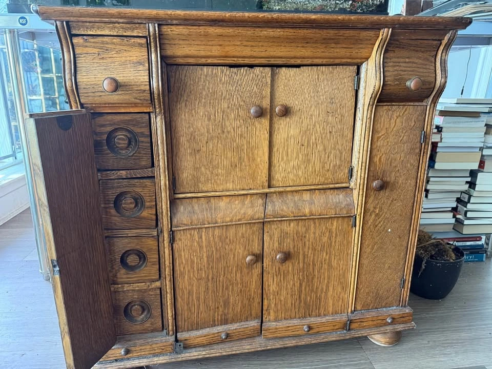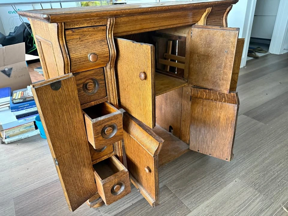 Beautiful quarter-sawn oak treadle sewing machine cabinet, originally designed to house a Singer or White machine. Features finely crafted recessed circular drawer pulls, hidden side drawers for spools, and a fold-away central compartment once used for the pedal and machine mount. The piece has been carefully refurbished, preserving the warm grain and sturdy joinery while maintaining its antique charm. Makes a stunning entryway cabinet, liquor console, or decorative sideboard. Details • Solid oak construction (quarter-sawn) • 5 hidden drawers, central double doors • Original early-1900s joinery and hardware style • Refinished, sturdy, ready for display • Estimated period: 1905–1920 Price: $350 CAD Pickup: Centretown Approximate dimensions: 84 cm high × 86 cm wide × 46 cm deep, with an internal top cutout about 36 × 18 cm for the original sewing machine mount.