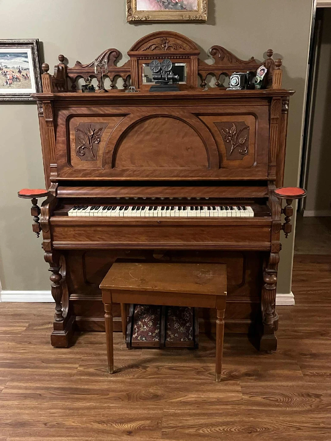 25Selling an antique pump organ that would be a beautiful addition to any home. It comes with a matching bench. The organ features intricate wood carvings and a unique vintage charm. It's a great piece for music lovers or anyone looking to add a touch of history to their decor