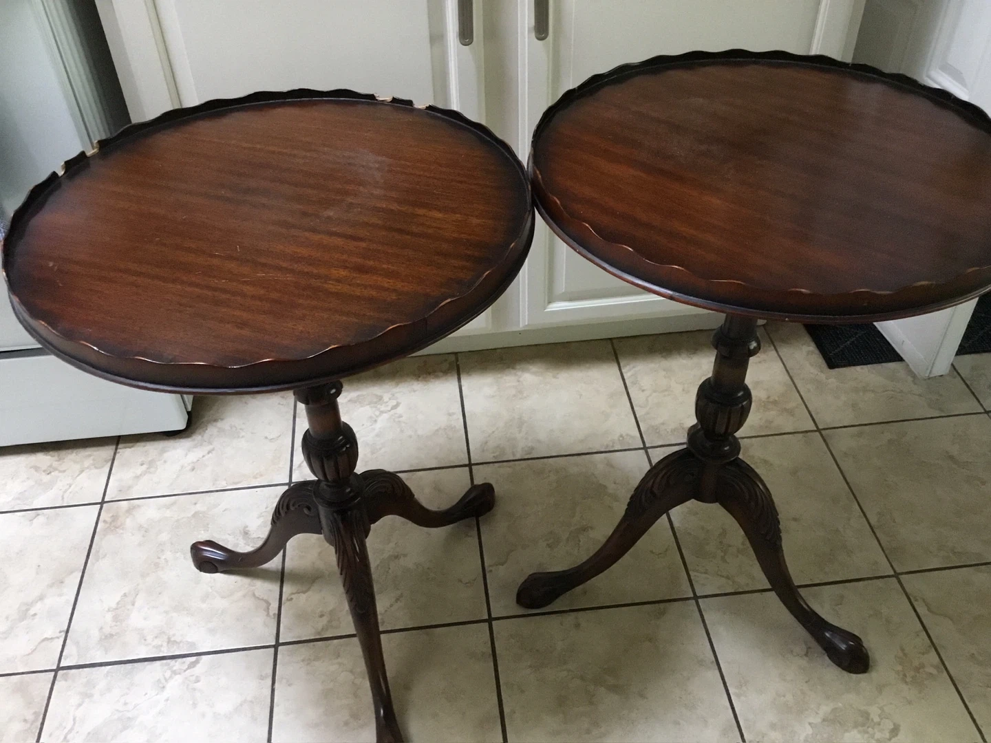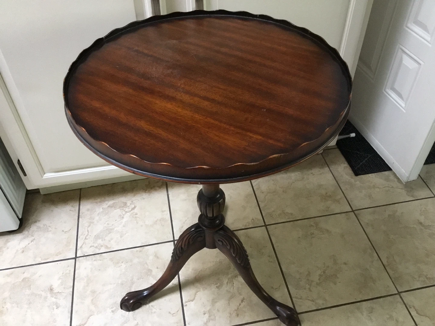 60Selling a lovely antique /vintage mahogany side tables. It has a beautiful scalloped edge and a classic pedestal base. It's in great condition and would make a wonderful addition to any home!