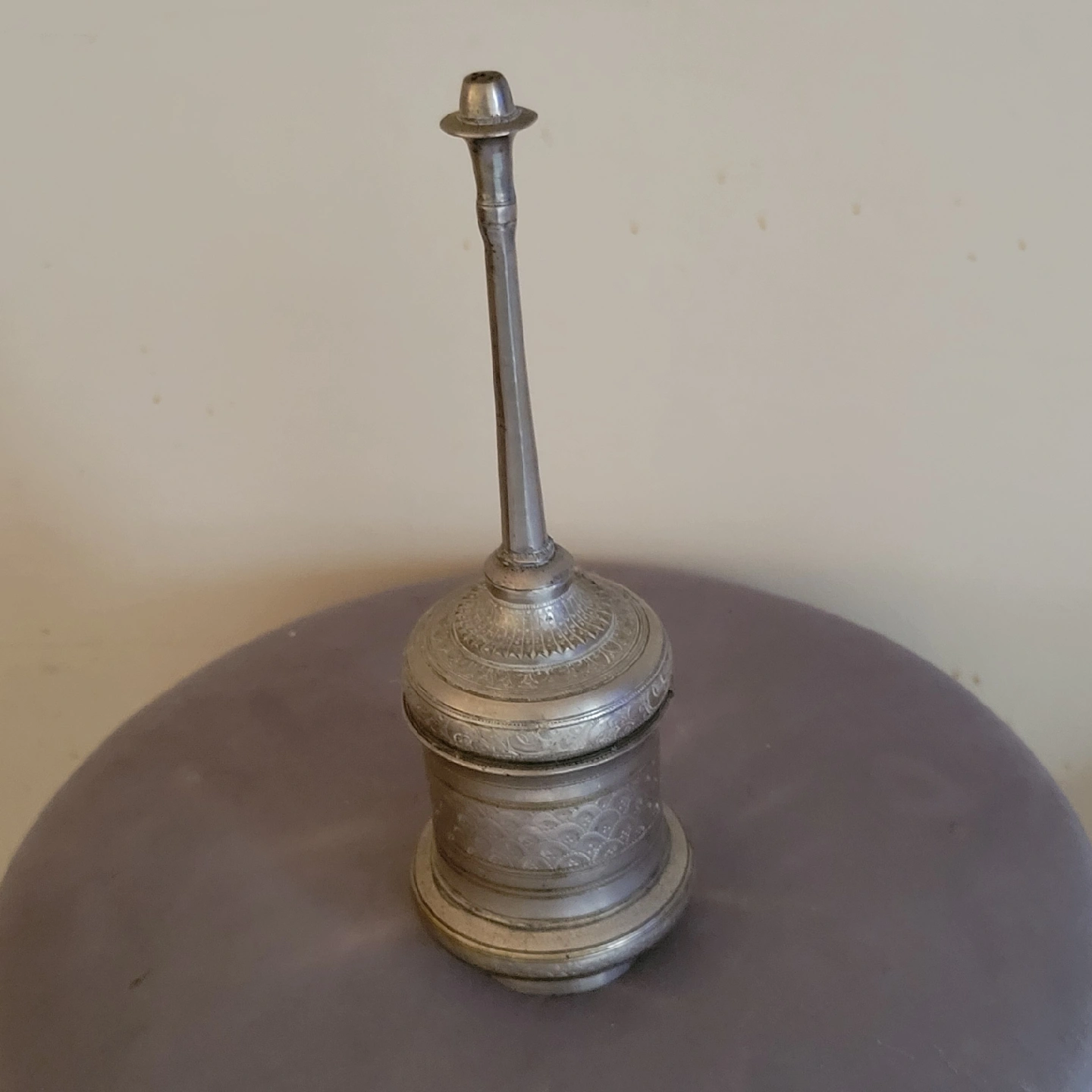I'm selling this beautiful antique silver kohl container! It has intricate designs etched into the metal. It's in good condition for its age and would make a lovely addition to any collection or decor