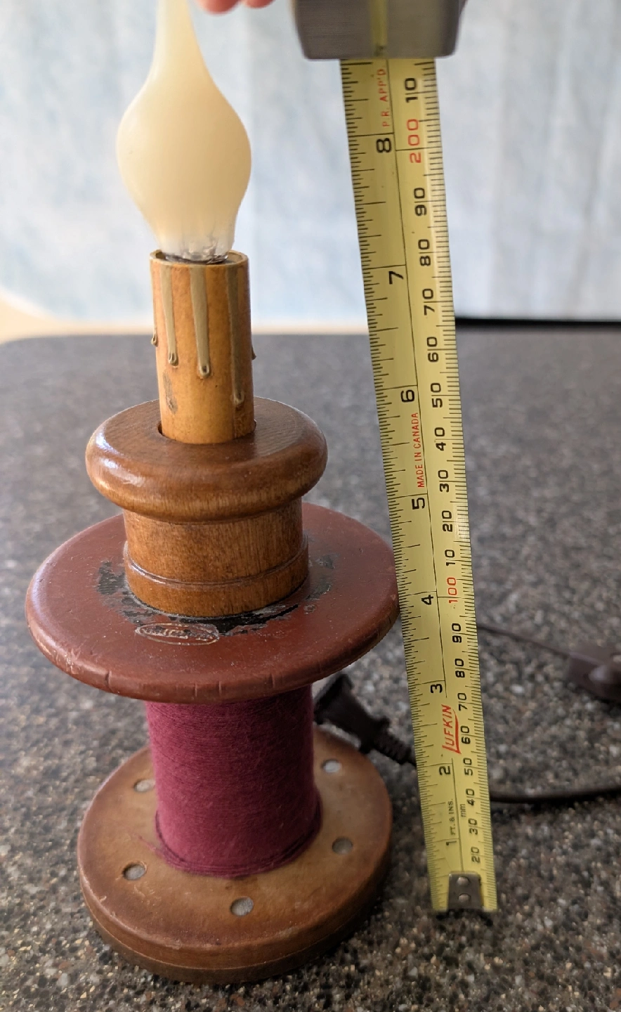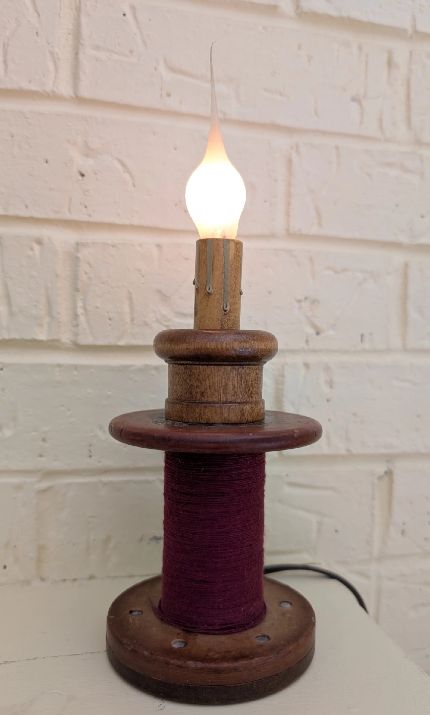 Check out this unique lamp! It features a vintage wooden spool base with burgundy thread and a candle-style bulb. It measures approximately 8 inches in height, making it a charming addition to any room. Free delivery in Dundas or West Hamilton. Or pickup near Governor's Road and Castlewood.
