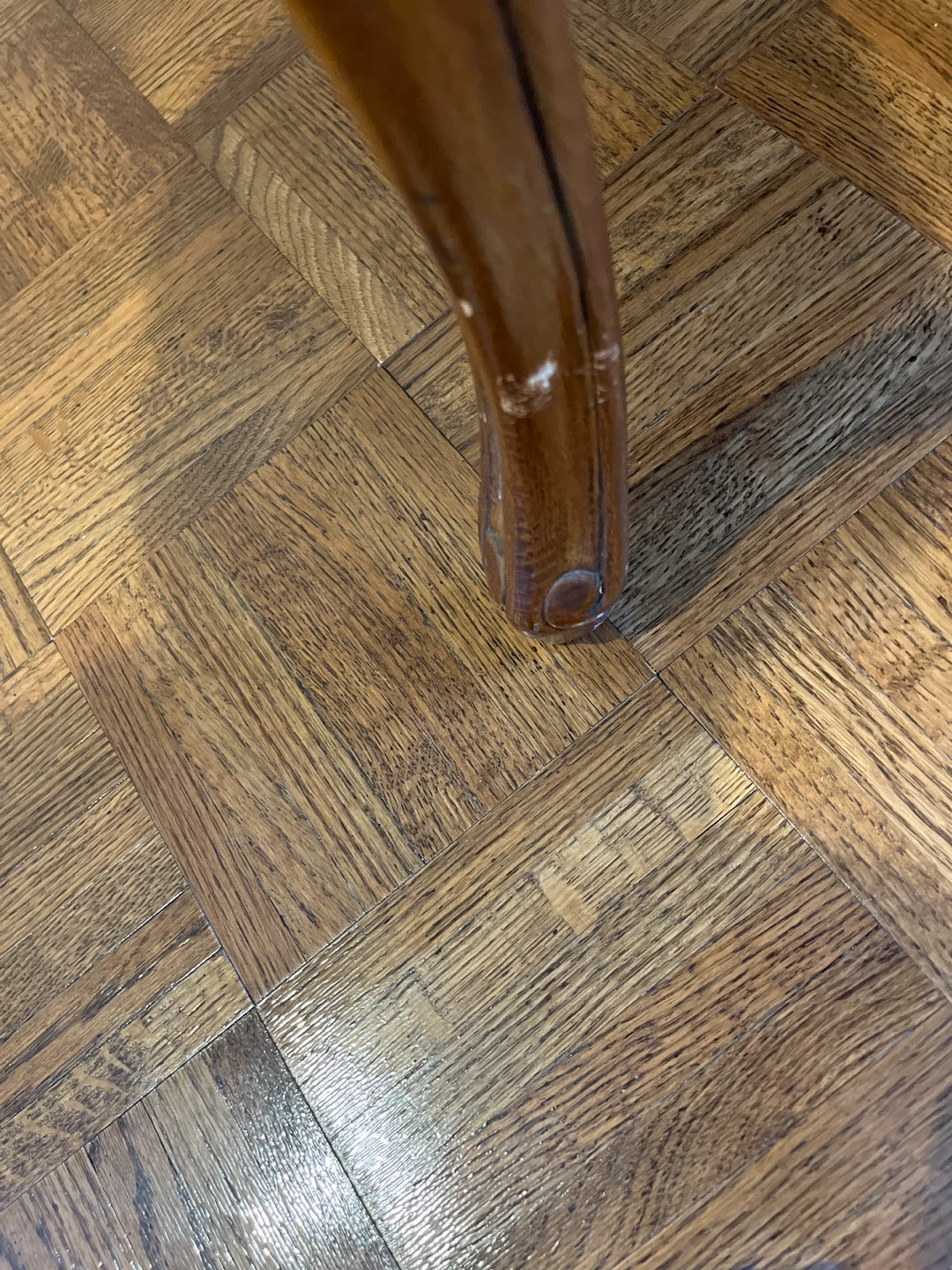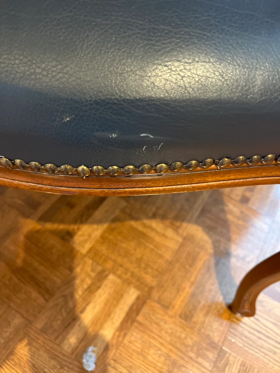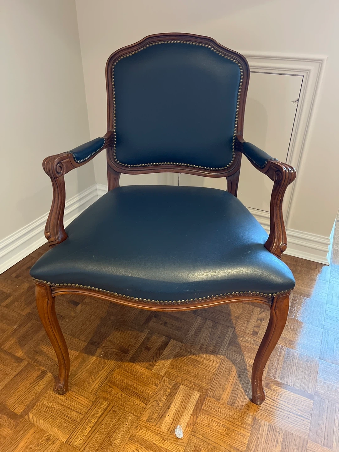 12Selling a lovely armchair with an antique-style design. It features dark blue leather and beautiful wood detailing. There are some minor signs of wear, but it's in overall good condition and ready to add some charm to your space!