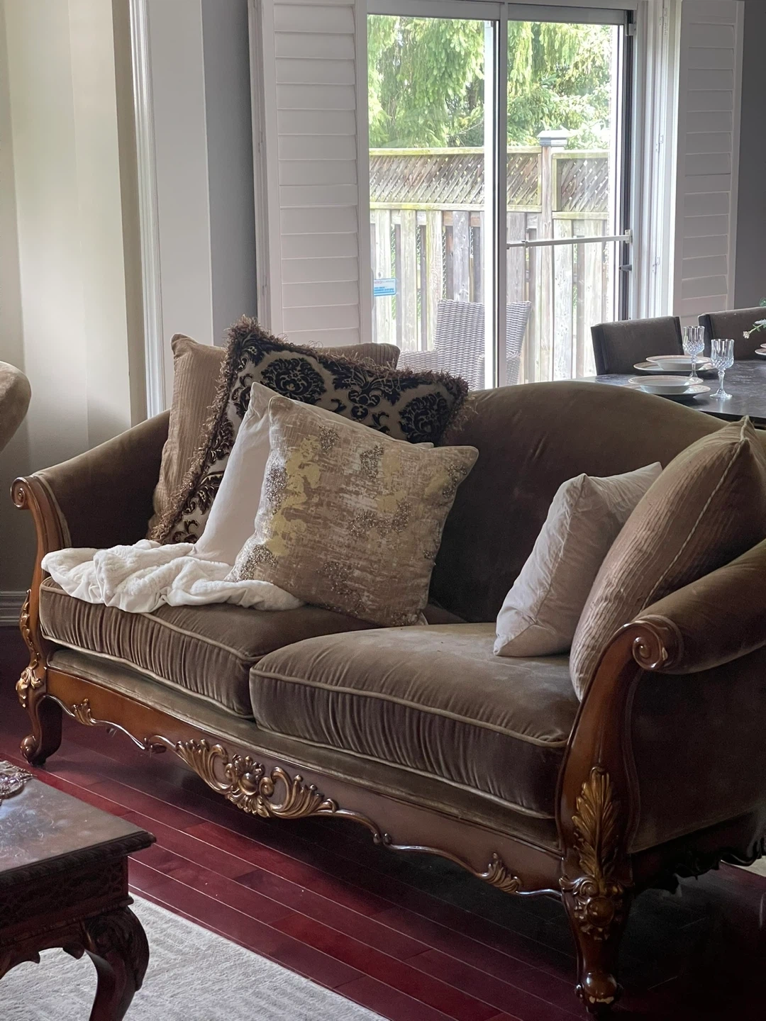 Selling a beautiful antique-style sofa and armchair set. This 4 piece set features a unique, ornate design and a comfortable velvet-like material in a neutral brown colour. Perfect for adding a touch of elegance to your living room or study!