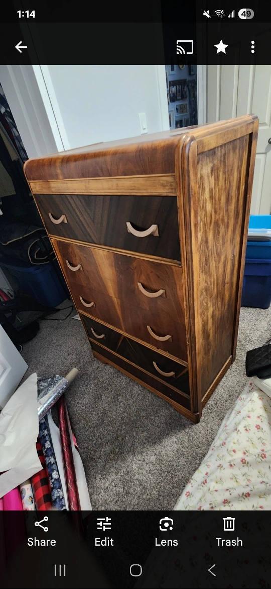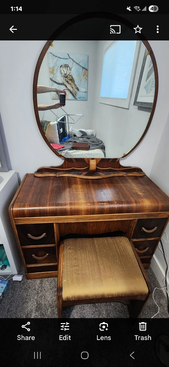 10Selling a beautiful antique waterfall dresser and vanity set! This set features a unique waterfall design and warm wood tones, perfect for adding a touch of vintage charm to any bedroom. The vanity comes with a matching stool and oval mirror. A timeless addition to your home!