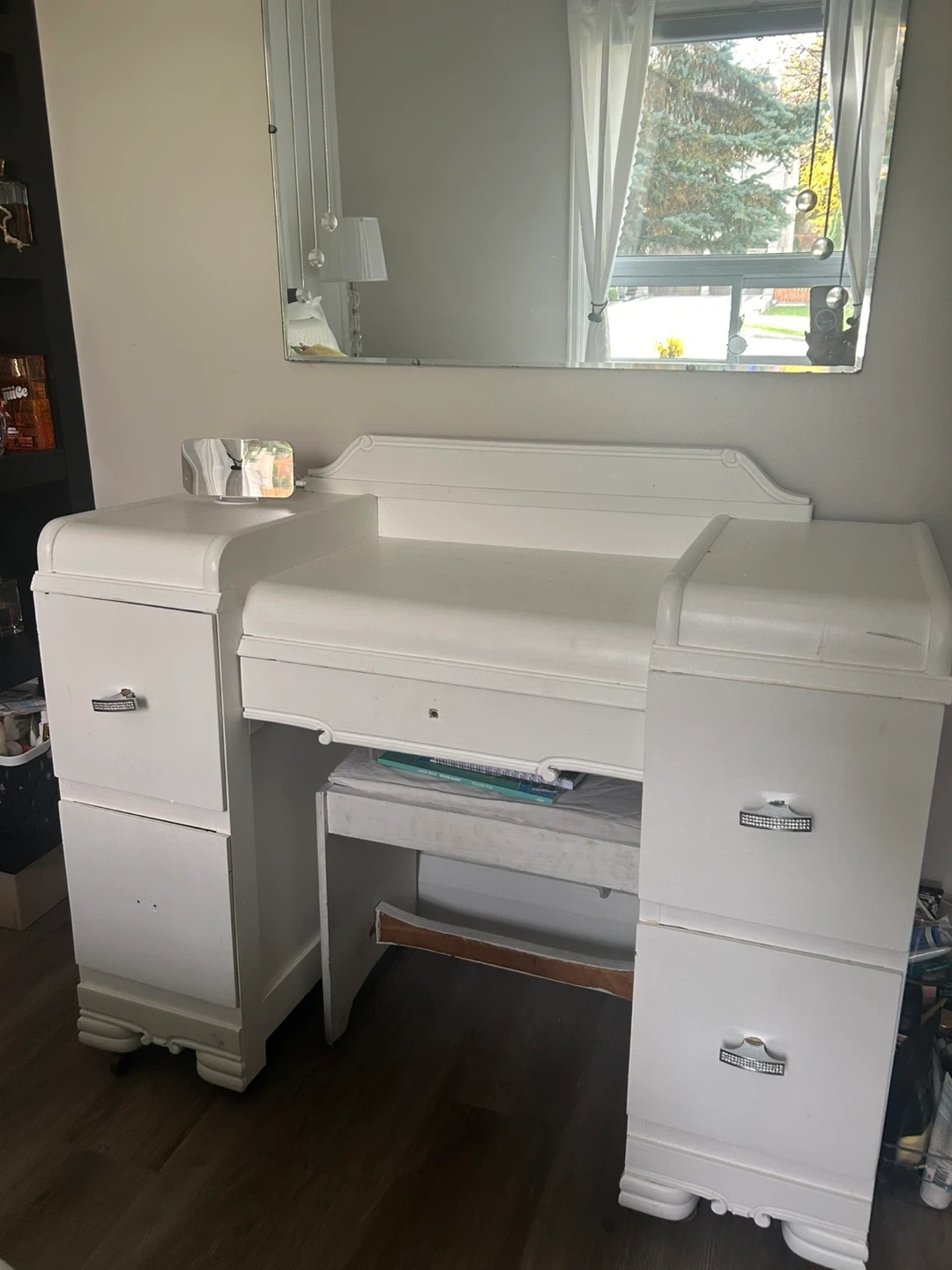 Selling an antique vanity desk with a mirror. It's painted white and features four deep drawers on either side and makeup drawer in the middle. Rhinestone knobs were added but missing one (can purchase from home depot). Selling as is.