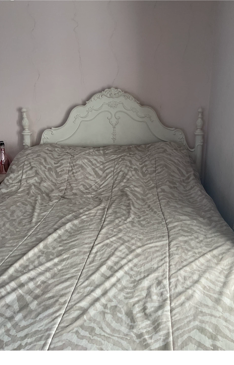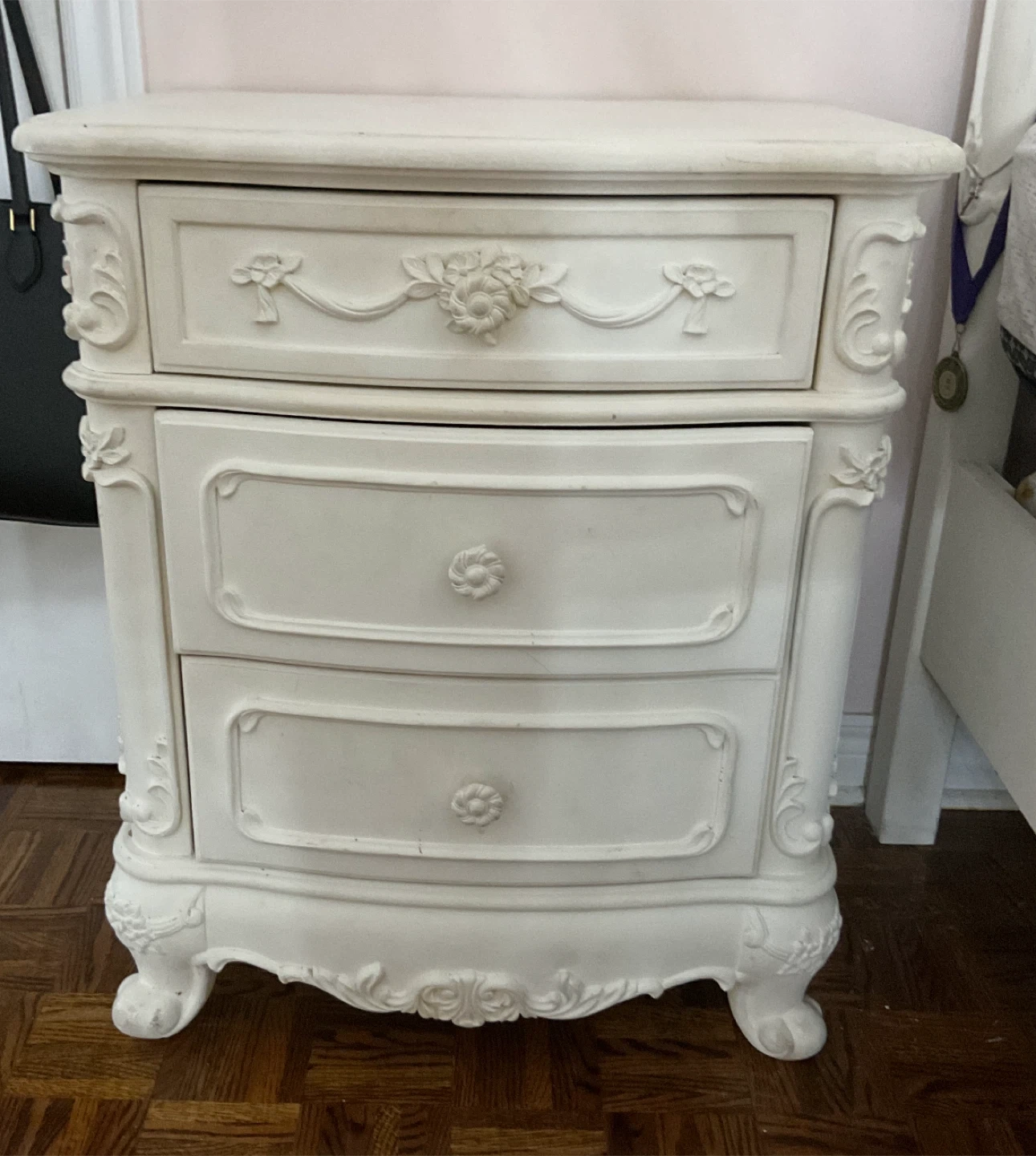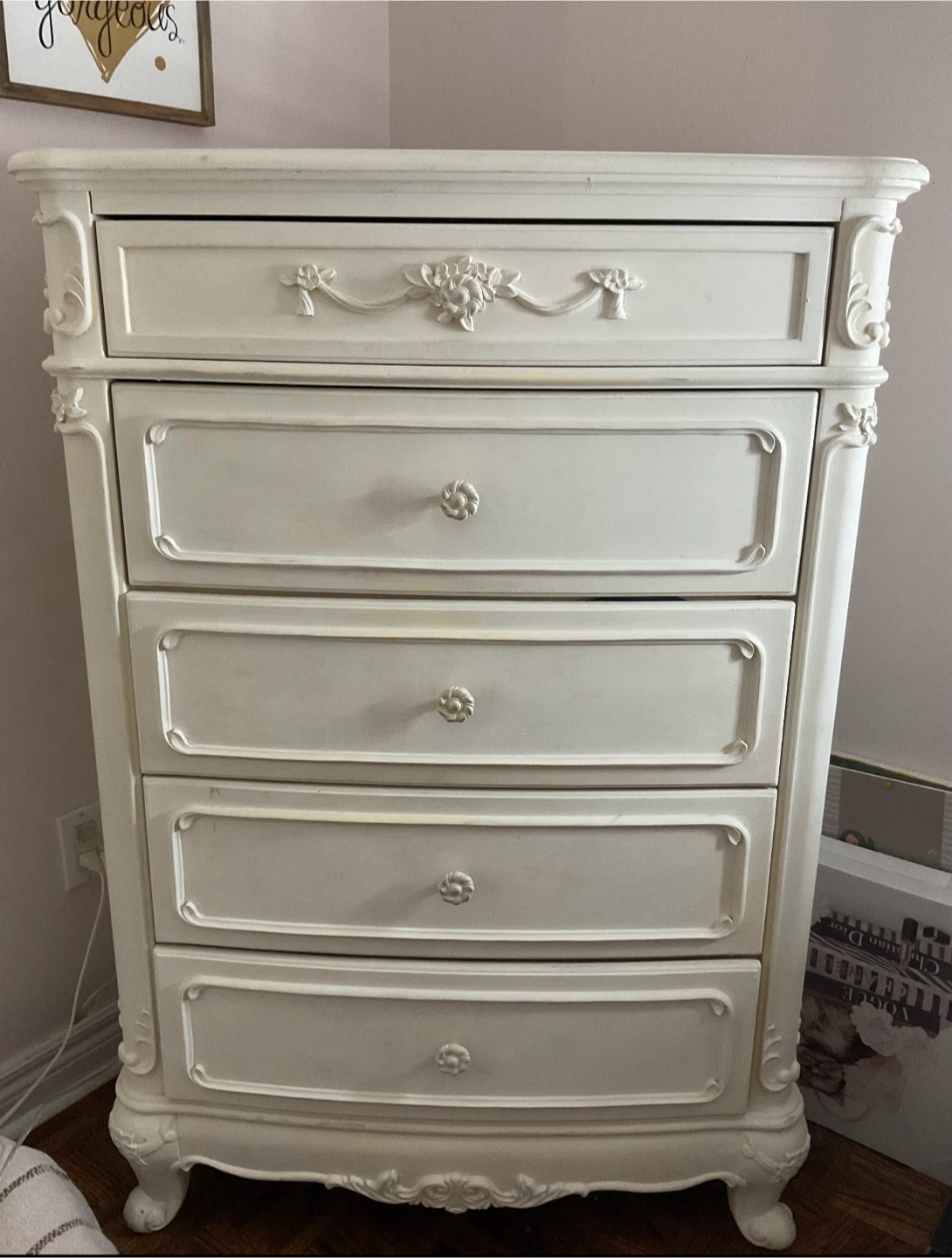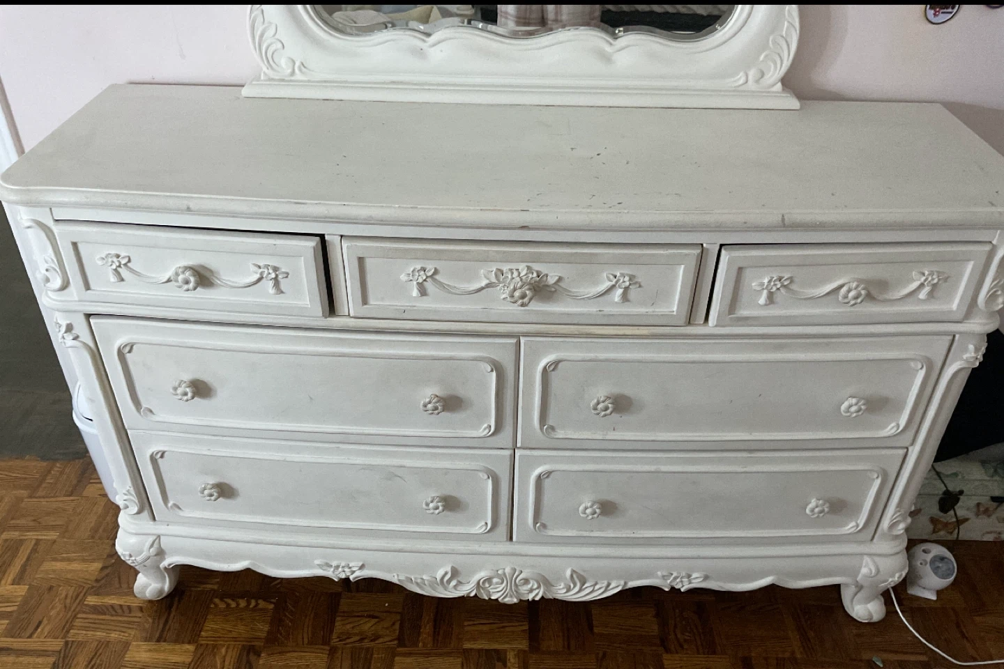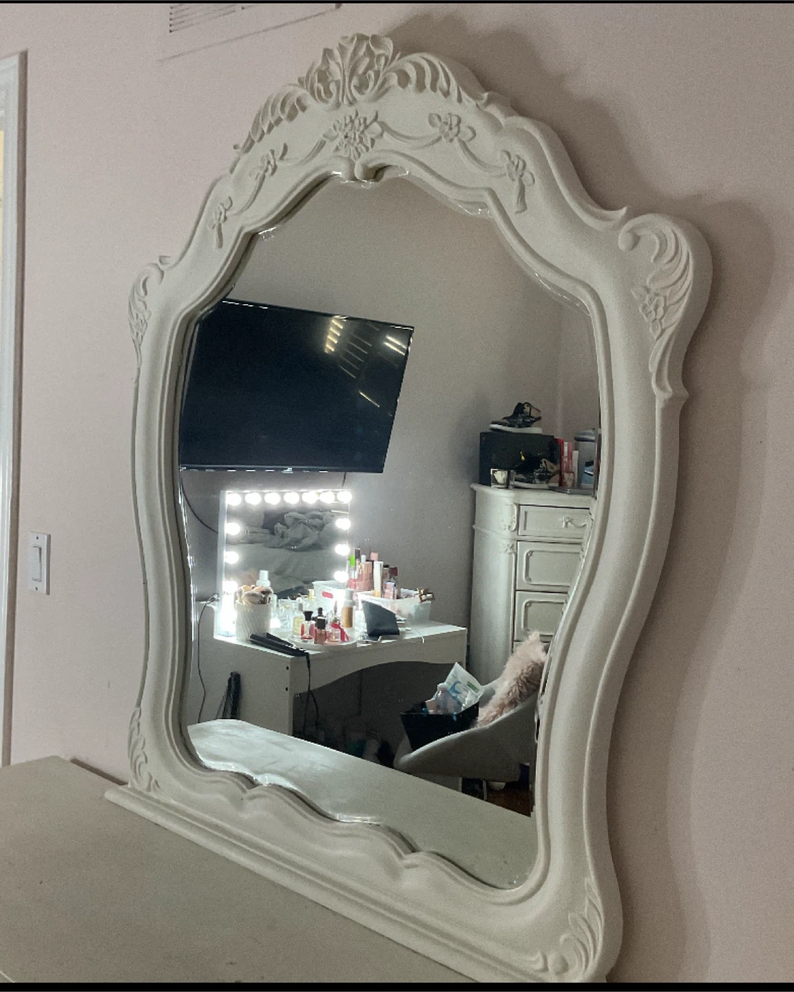 Selling a lovely antique-style vanity mirror and dresser set. The set includes a large dresser, a smaller dresser, and a vanity mirror. All pieces are finished in an antique white colour and feature ornate detailing. This set would be a beautiful addition to any bedroom! Needs a fresh paint finish.