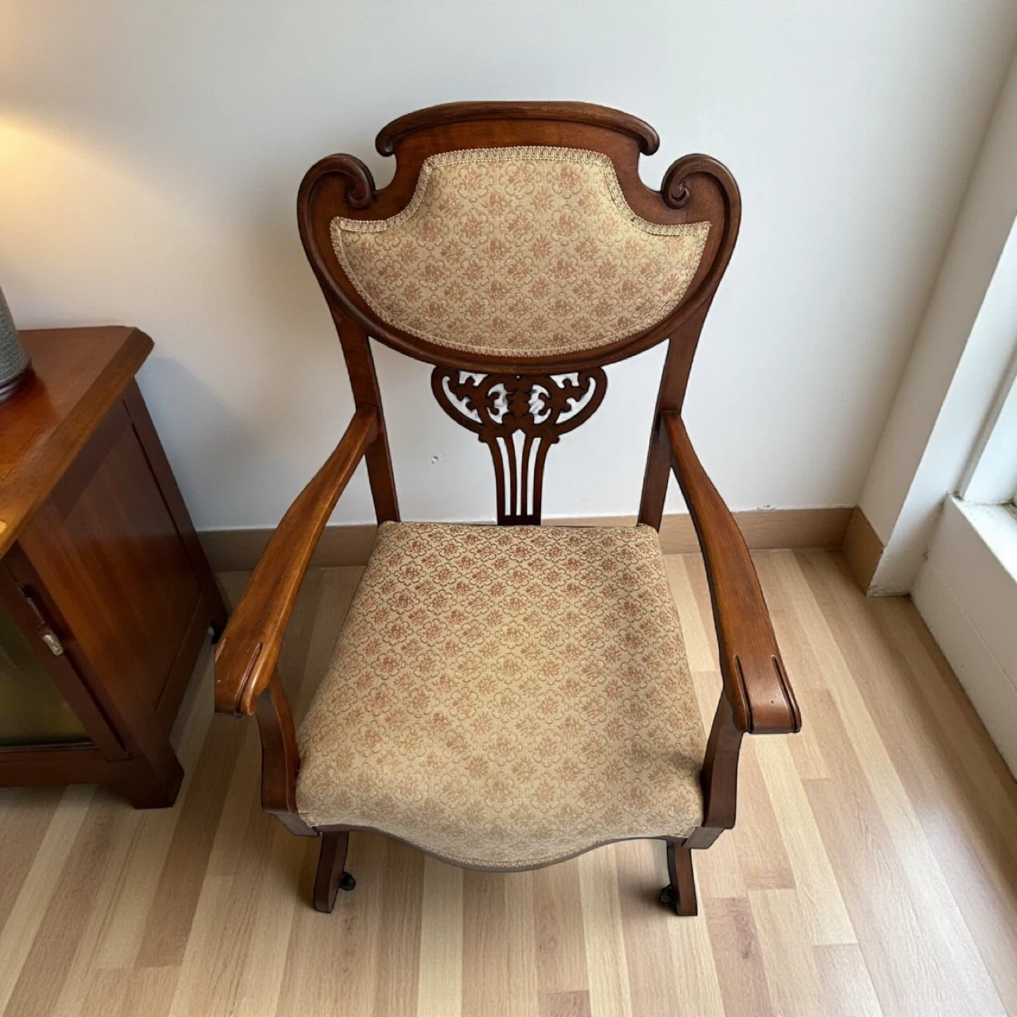 Selling a beautiful antique wooden armchair. It features a unique design with carved details and patterned upholstery. It's a charming piece that would add character to any room!