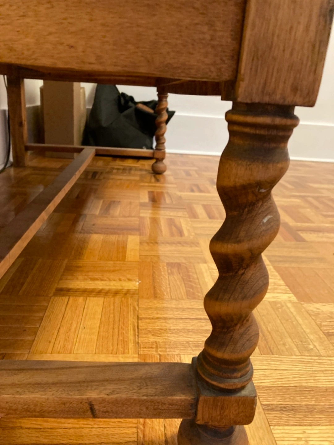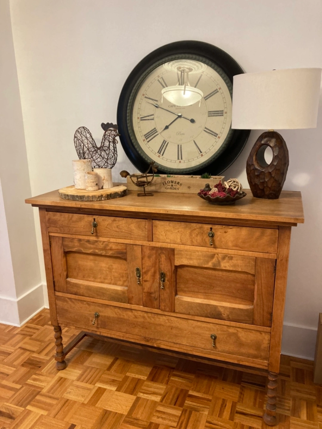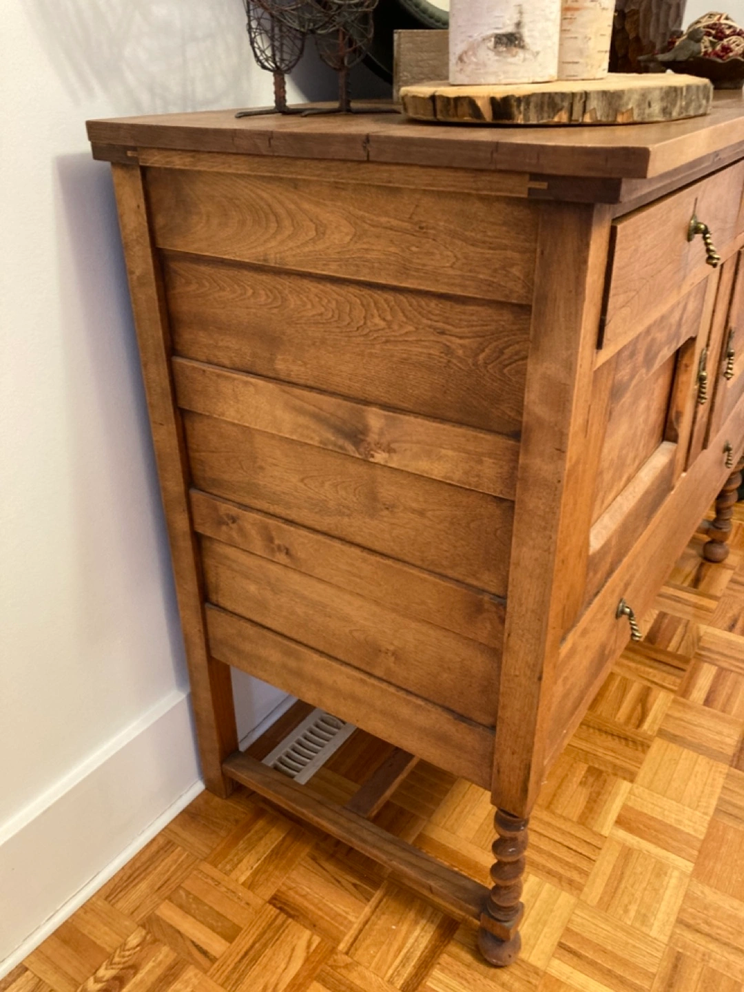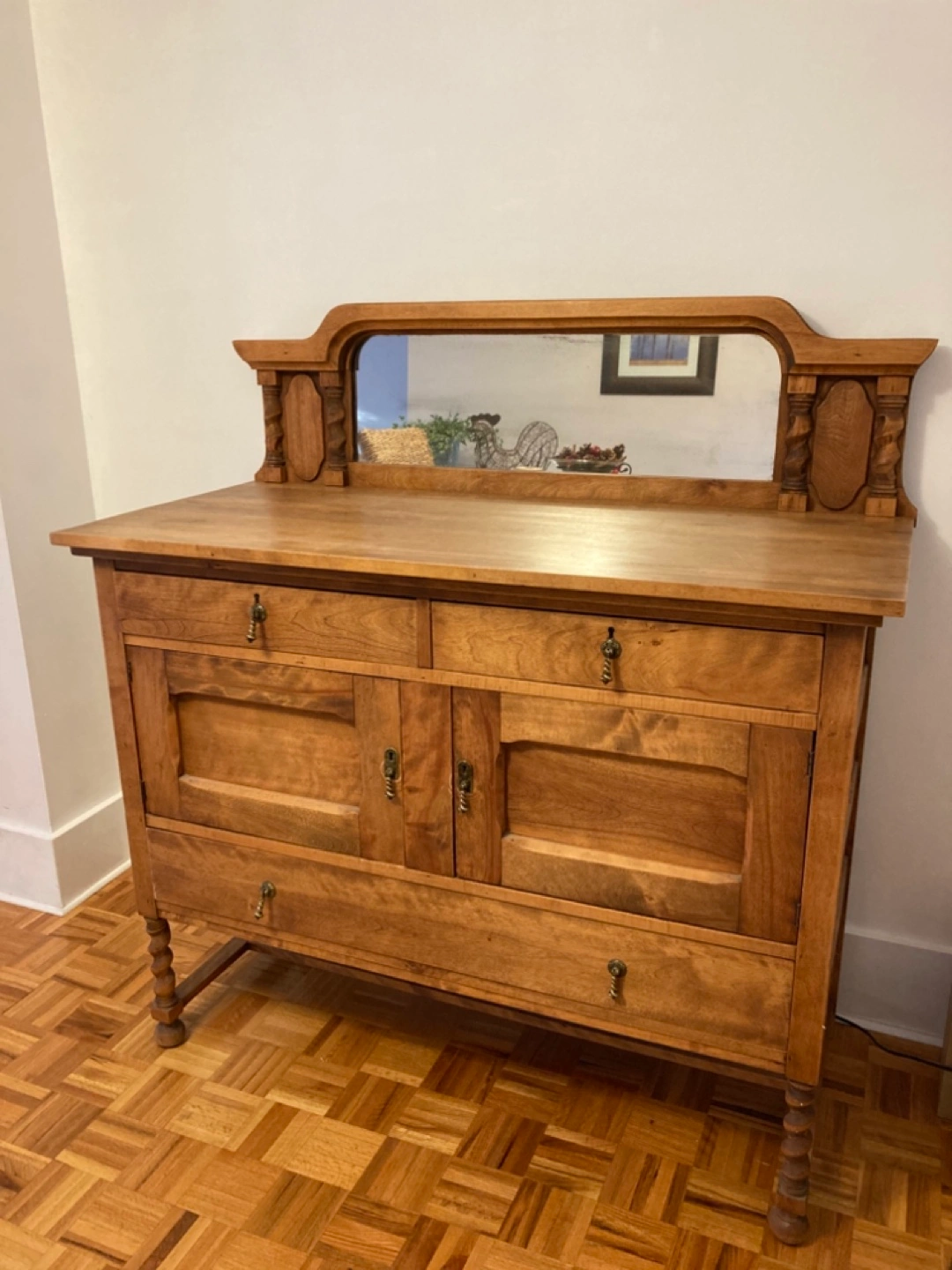 96Antique wooden buffet cabinet/sideboard with two doors and three drawers. The cabinet features a unique twisted leg design. Mirrored back with hardware measures 13.5 Good condition. Small nick but you can’t see it when mirror is attached (see photo). From smoke-free/pet-free home Delivery not available Pick up in Westwood