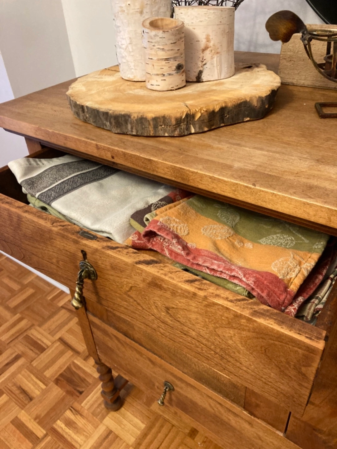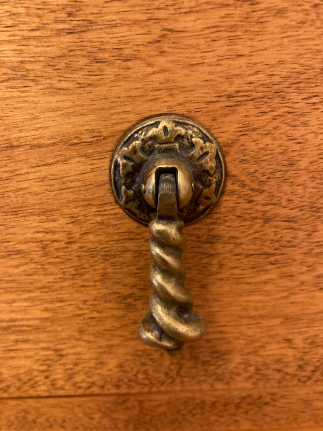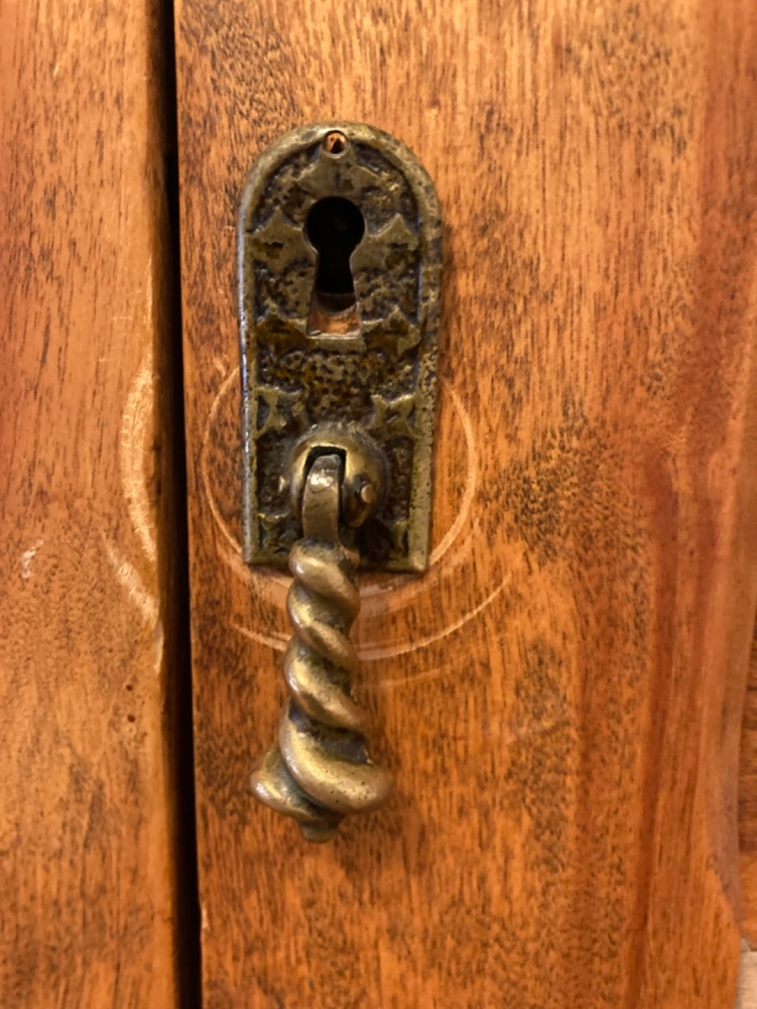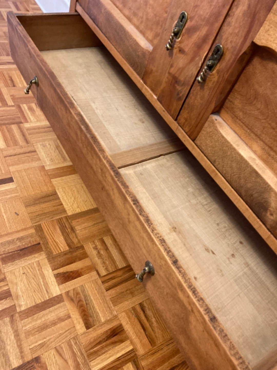 96Antique wooden buffet cabinet/sideboard with two doors and three drawers. The cabinet features a unique twisted leg design. Mirrored back with hardware measures 13.5 Good condition. Small nick but you can’t see it when mirror is attached (see photo). From smoke-free/pet-free home Delivery not available Pick up in Westwood