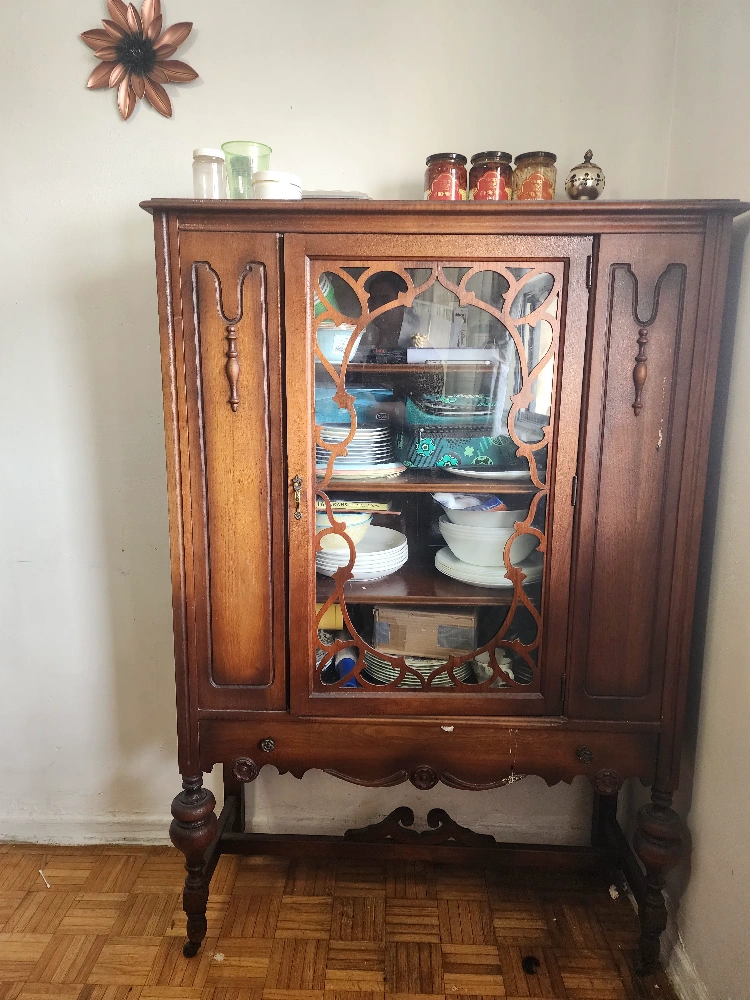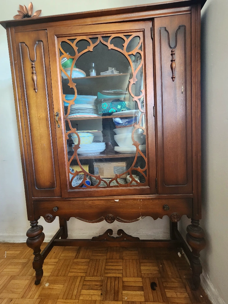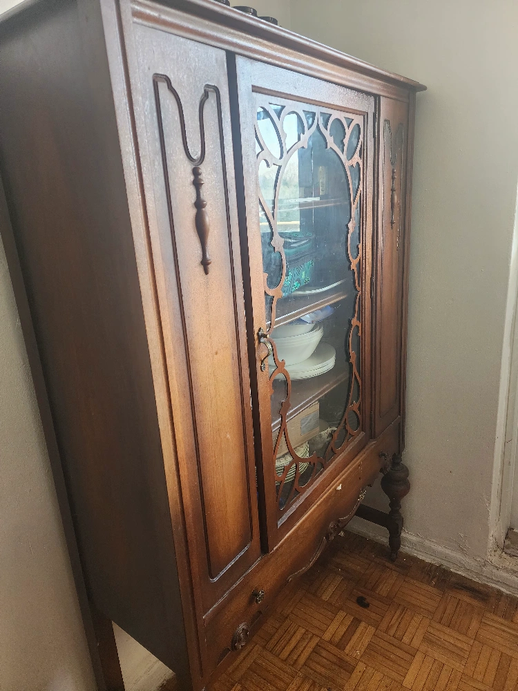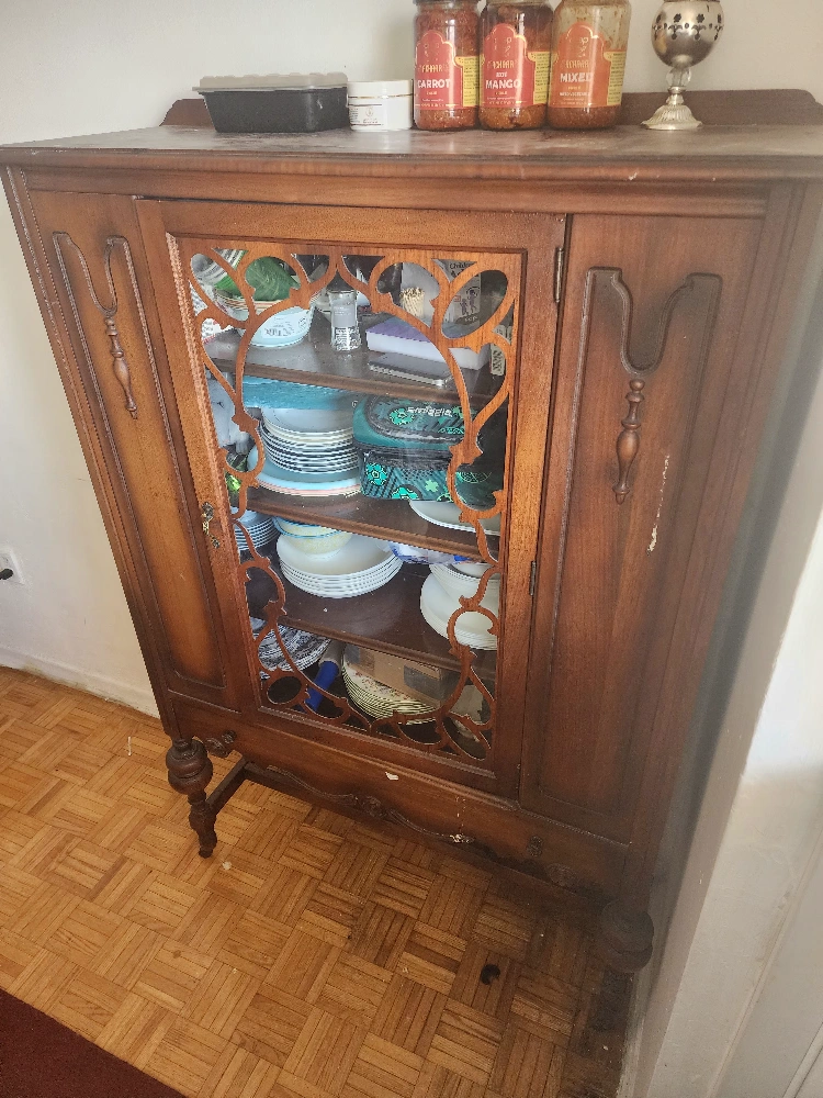 Vintage wooden cabinet. Features glass-paned doors, shelves, and carved detailing. Classic style. Solid wood construction. Shows some wear consistent with age.