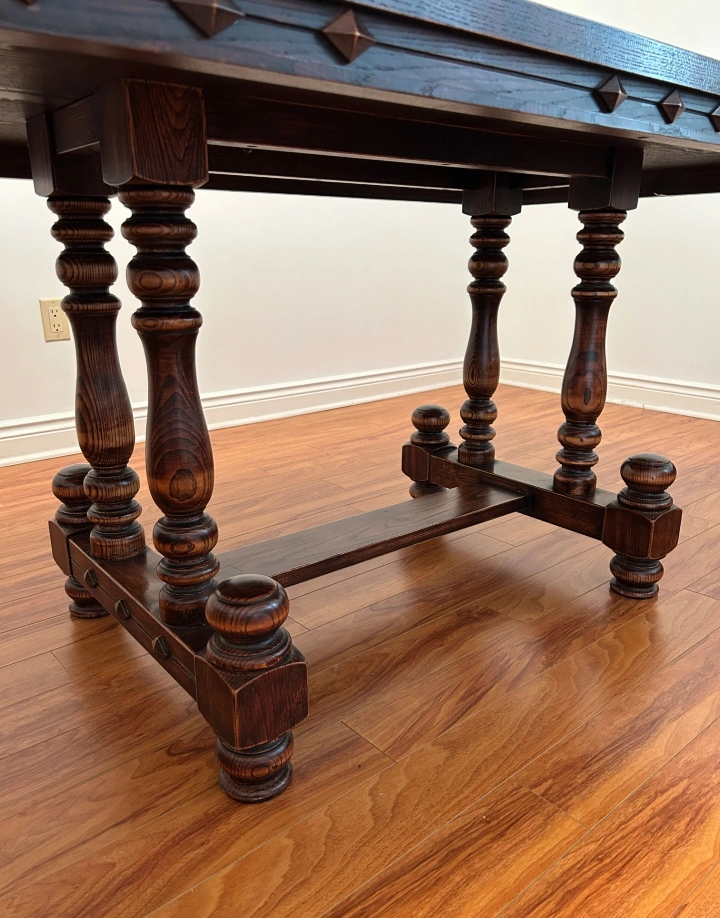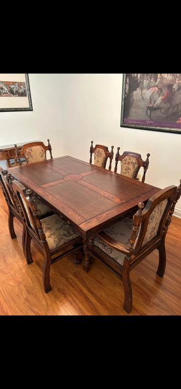 Selling a beautiful antique wooden dining table that comes with six matching chairs. It's a solid, sturdy set that would look great in any dining room. The table and chairs have a lovely, classic design and are in good condition for their age. A great set to add some character to your home!
