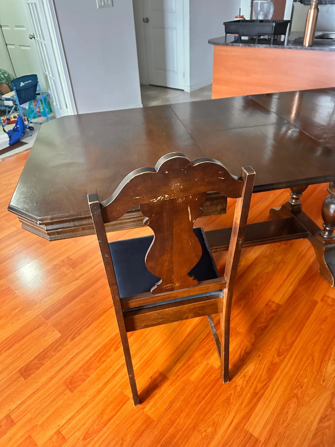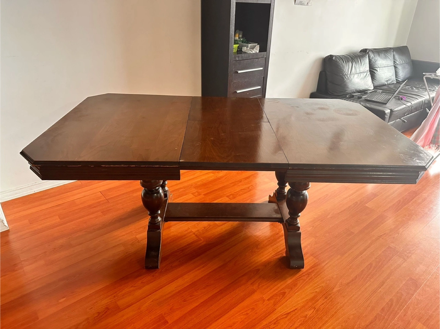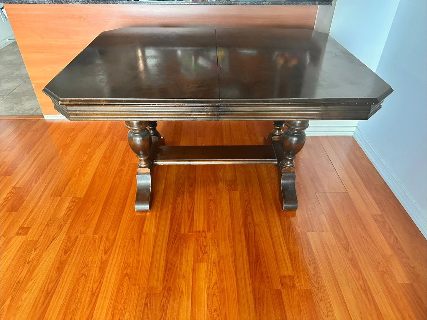 Dark brown wooden extendable dining table. Features a pedestal base and octagonal top. Perfect for a vintage or classic interior. It comes with 4 chairs