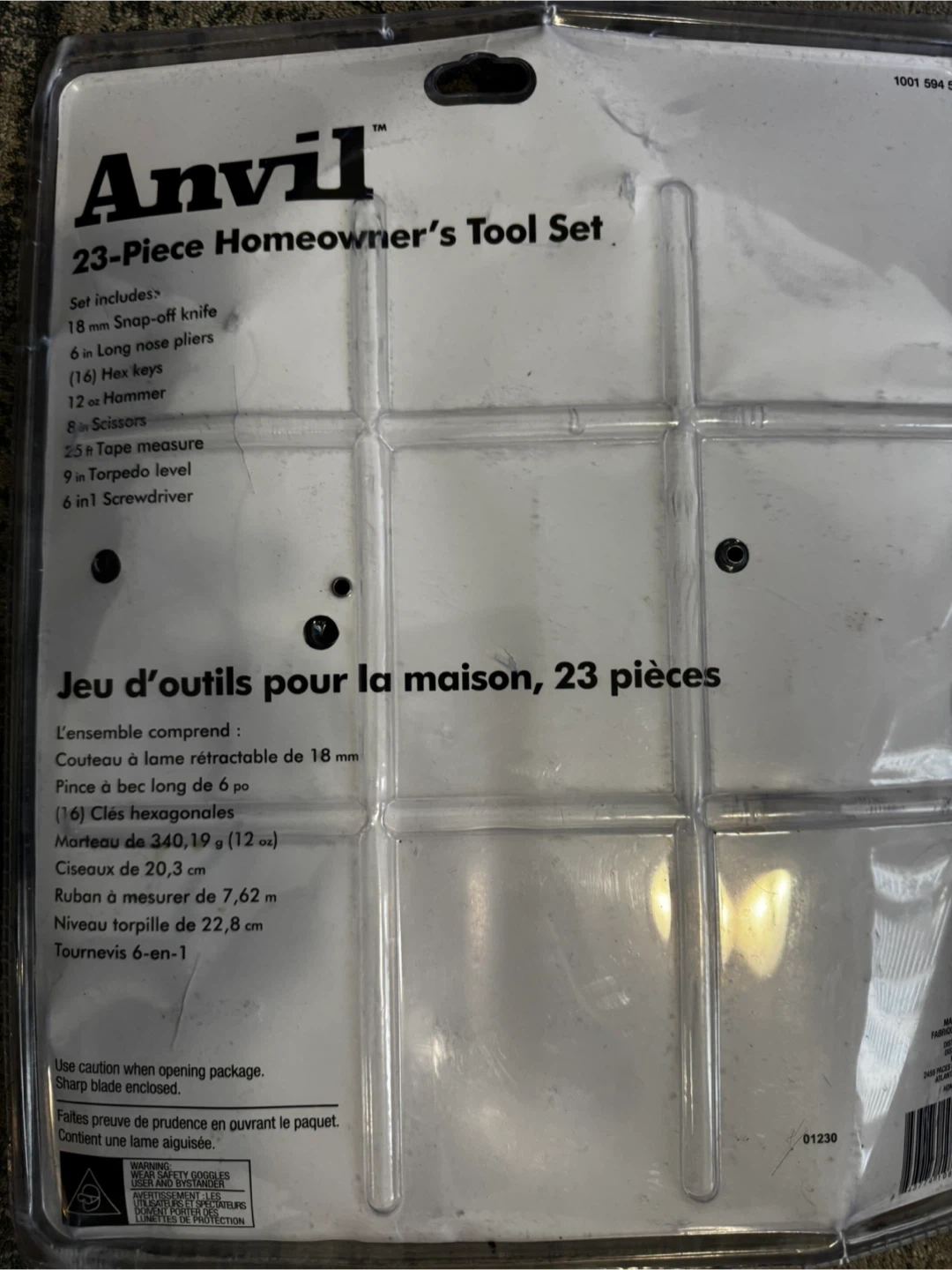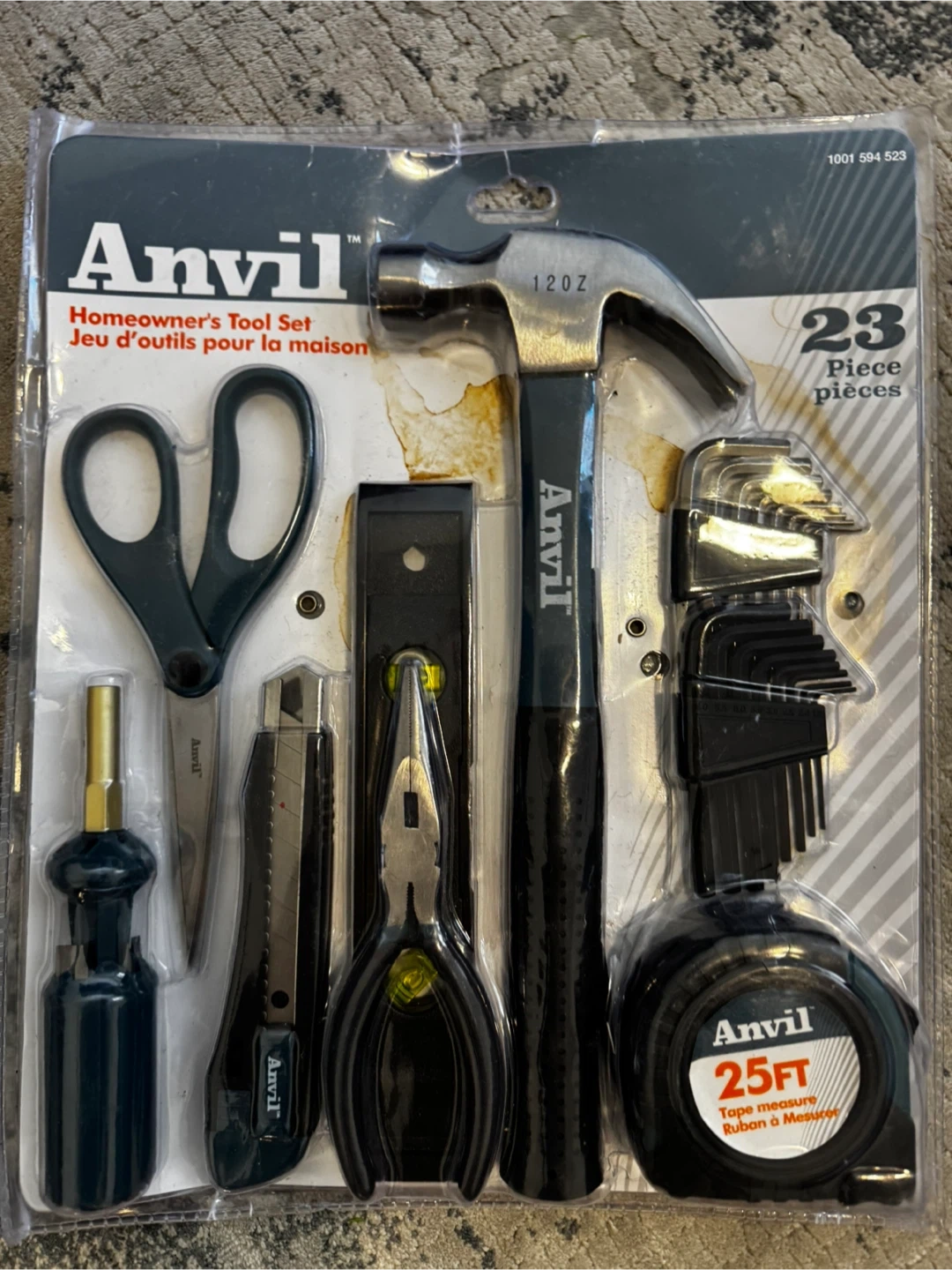 Selling a brand new Anvil 23-Piece Homeowner's Tool Set! This set includes: - 18 mm Snap-off knife - 6 in Long nose pliers - (16) Hex keys - 12 oz Hammer - 8 in Scissors - 25 ft Tape measure - 9 in Torpedo level - 6 in 1 Screwdriver $25 Yonge and finch area