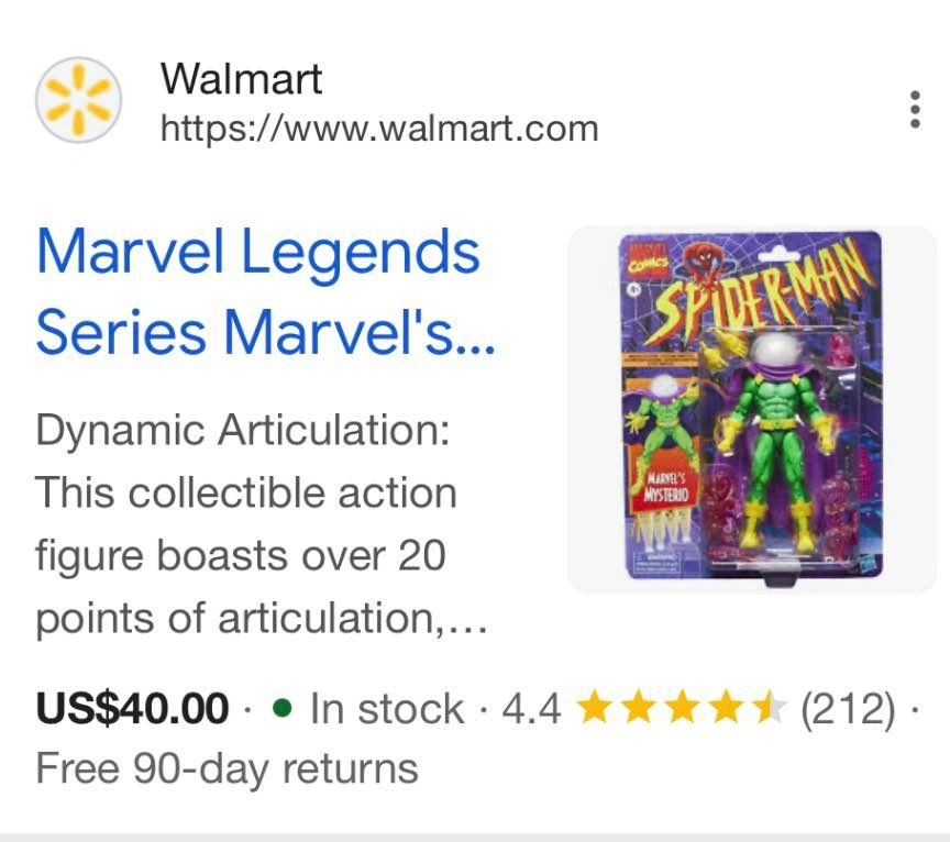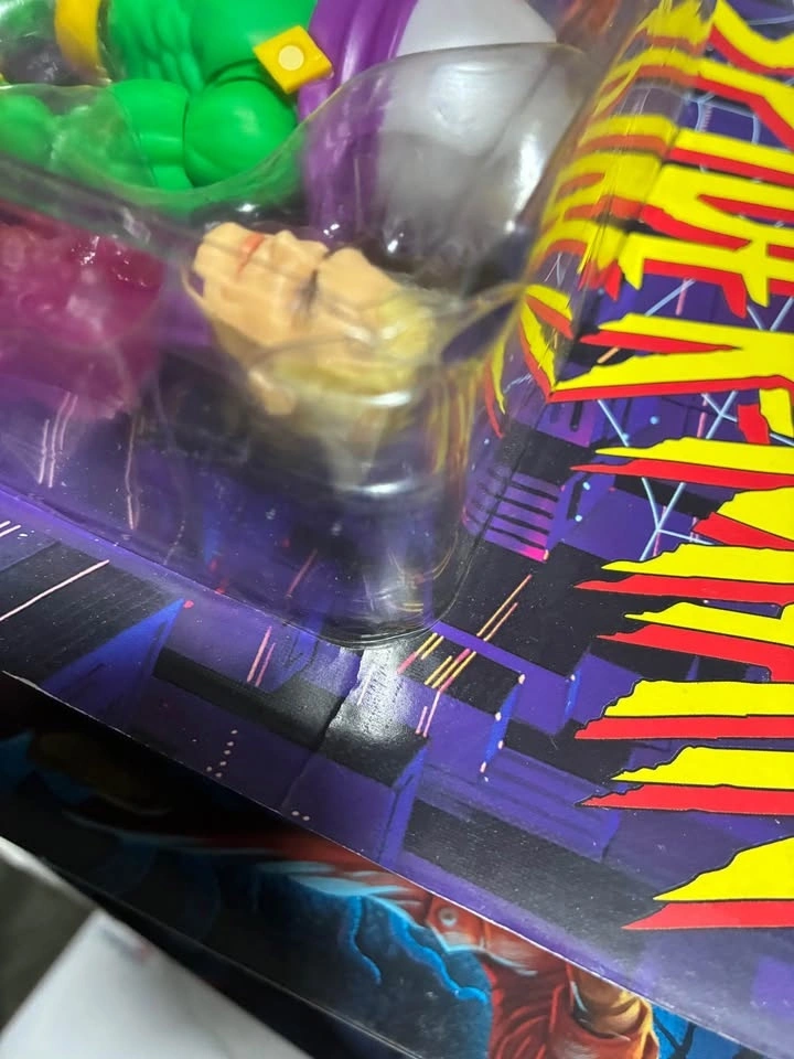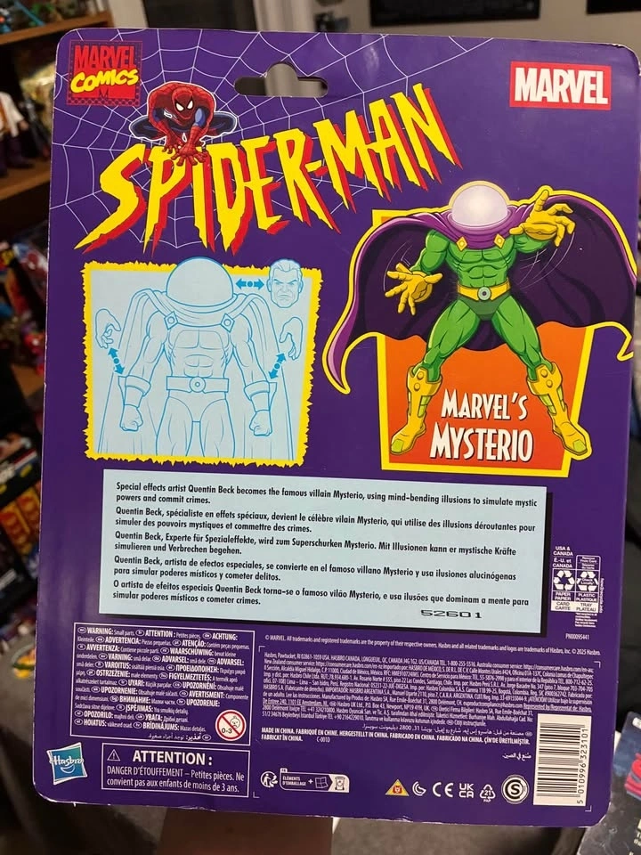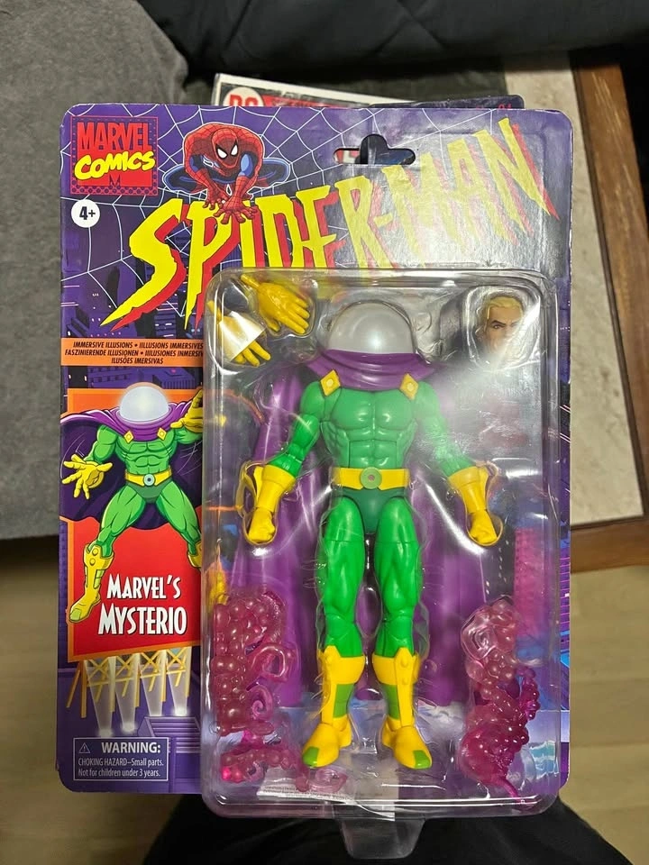 Marvel Legends Retro Collection Mysterio action figure, inspired by his appearance in the classic animated series. Brand: Hasbro Marvel Legends Series. Scale: 6-inch scale. Accessories: Includes an unmasked Quentin Beck head, alternate hands, and purple smoke effects. This was a Walmart exclusive. Bubble had a minor crease. Selling for $45US.