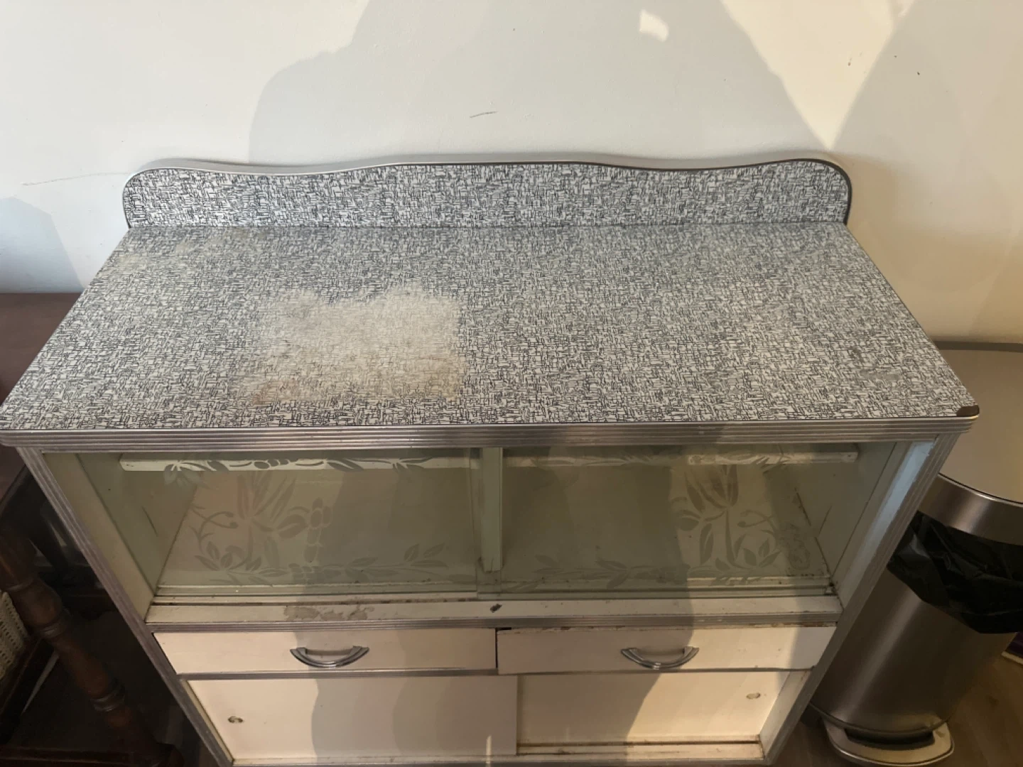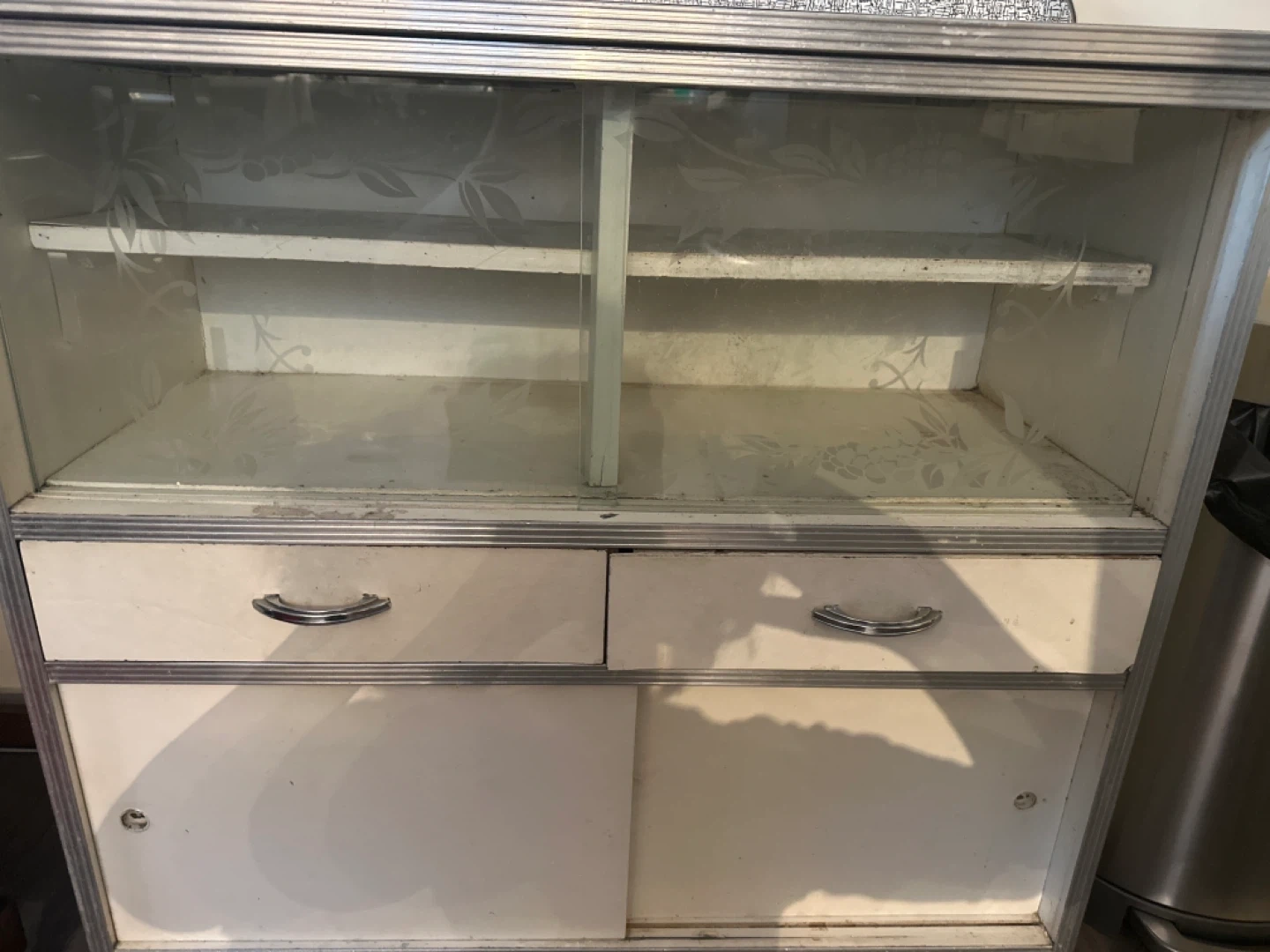 This vintage display cabinet features a glass front with sliding doors and two drawers. It's a great piece for storing and showcasing items. It could use a little TLC as it’a been well used, but it’s solid and with a face lift will be a great addition to any home, shop or even workshop.