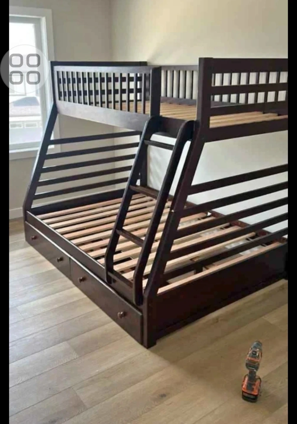 Dark wood bunk bed with ladder access. Features storage drawers built into the base. Perfect for maximizing bedroom space for kids or guests! 905 965 1167