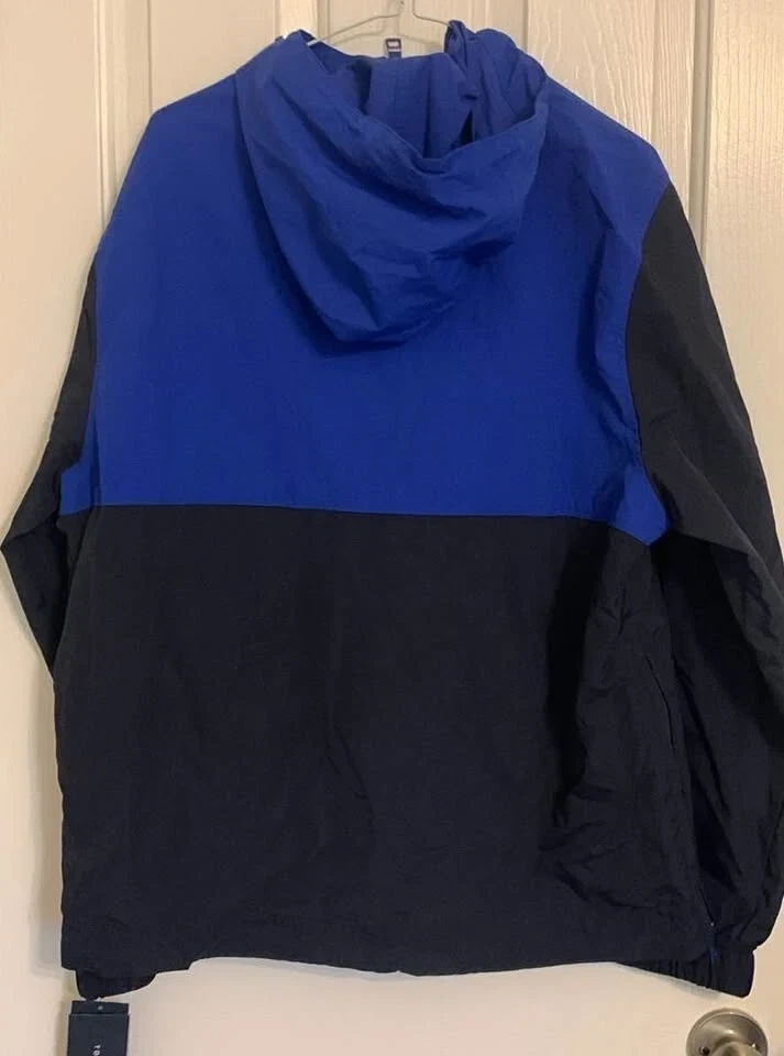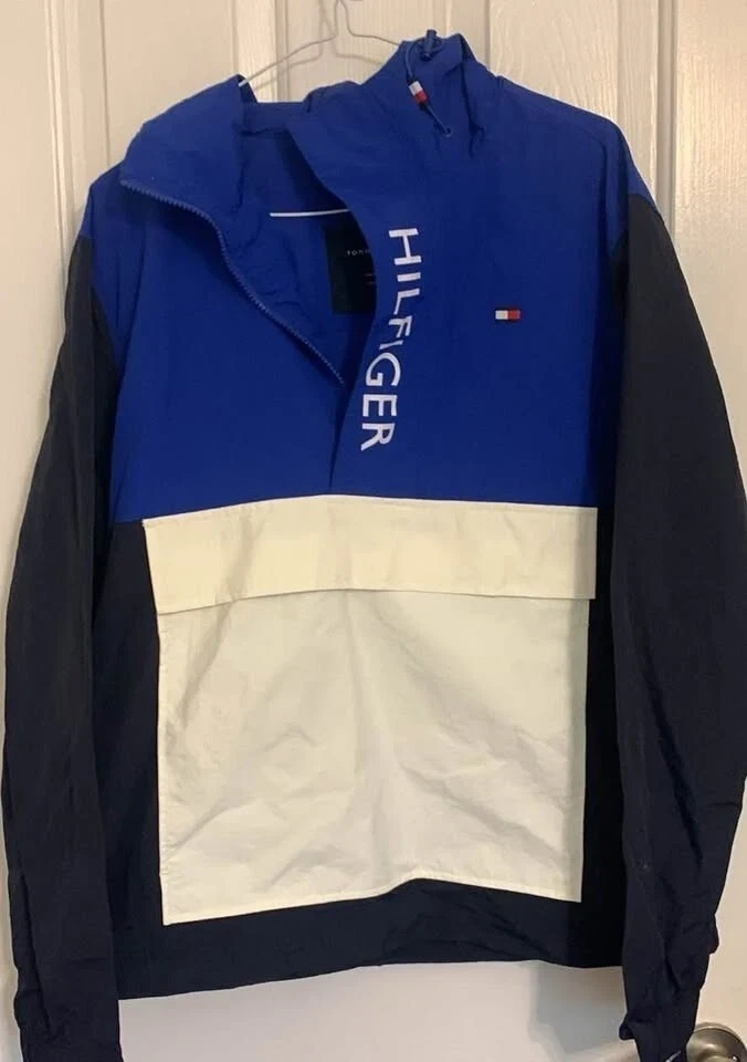 Tommy Hilfiger windbreaker jacket brand new w tags. The jacket is a size medium and features a stylish colour block design with blue, black, and white. It's water and wind resistant, perfect for those unpredictable weather days!